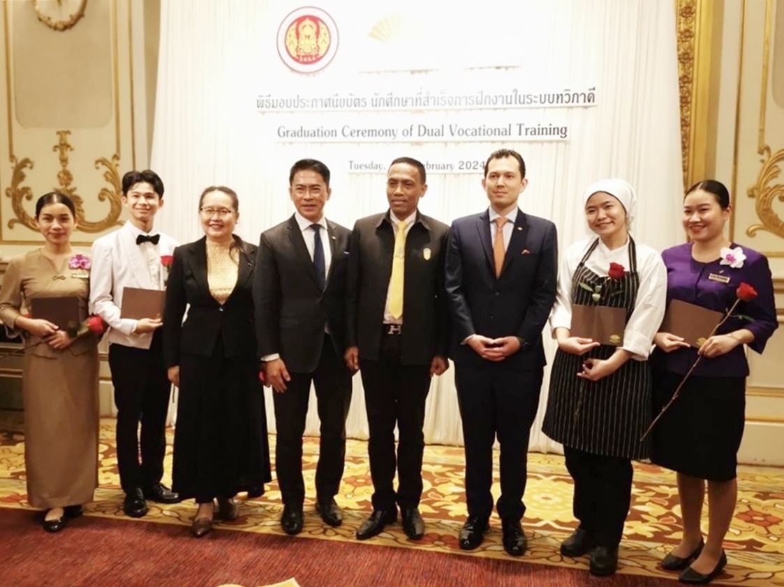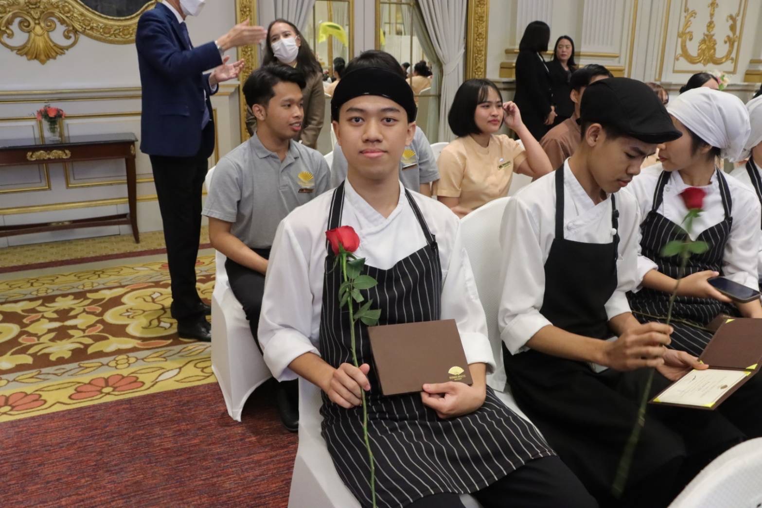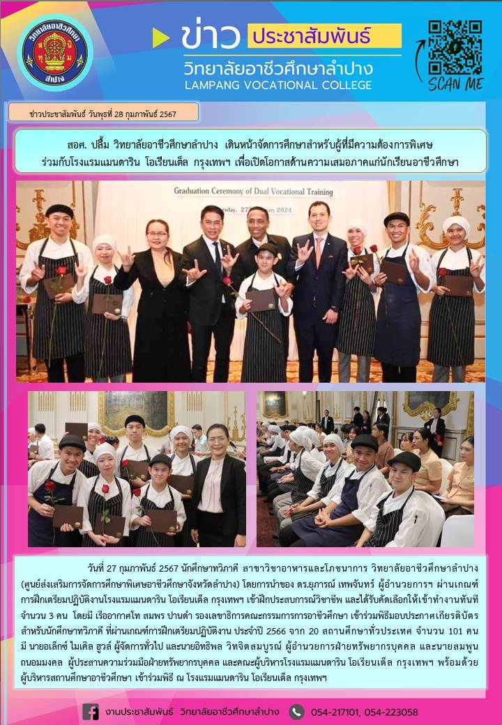 วันที่ 27กุมภาพันธ์ 2567นักศึกษาทวิภาคี สาขาวิชาอาหารและโภชนาการ วิทยาลัยอาชีวศึกษาลำปาง (ศูนย์ส่งเสริมการจัดการศึกษาพิเศษอาชีวศึกษาจังหวัดลำปาง) โดยการนำของ ดร.ยุภารณ์ เทพจันทร์ ผู้อำนวยการฯ ผ่านเกณฑ์การฝึกเตรียมปฏิบัติงานโรงแรมแมนดาริน โอเรียนเต็ล กรุงเทพฯ เข้าฝึกประสบการณ์วิชาชีพ และได้รับคัดเลือกให้เข้าทำงานทันที จำนวน 3คน โดยมี เรืออากาศโท สมพร ปานดำ รองเลขาธิการคณะกรรมการการอาชีวศึกษา เข้าร่วมพิธีมอบประกาศเกียรติบัตร สำหรับนักศึกษาทวิภาคี ที่ผ่านเกณฑ์การฝึกเตรียมปฏิบัติงาน ประจำปี 2566จาก 20สถานศึกษาทั่วประเทศ จำนวน 101คน มี นายอเล็กซ์ ไมเคิล ฮูวล์ ผู้จัดการทั่วไป และนายอิทธิพล วิทจิตสมบูรณ์ ผู้อำนวยการฝ่ายทรัพยากรบุคคล และนายสมพูน ถนอมมงคล ผู้ประสานความร่วมมือฝ่ายทรัพยากรบุคคล และคณะผู้บริหารโรงแรมแมนดาริน โอเรียนเต็ล กรุงเทพฯ พร้อมด้วยผู้บริหารสถานศึกษาอาชีวศึกษา เข้าร่วมพิธี ณ โรงแรมแมนดาริน โอเรียนเต็ล กรุงเทพฯ
