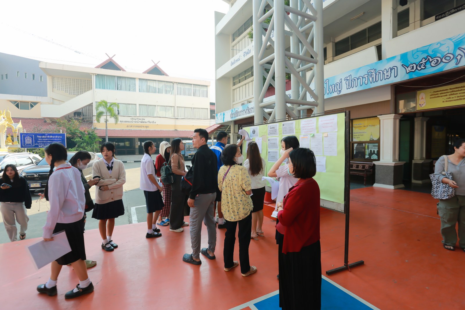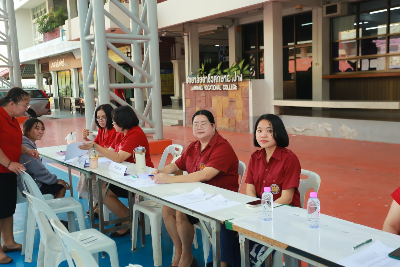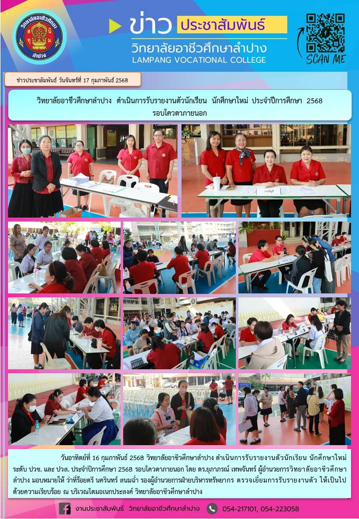 วันอาทิตย์ที่ 16 กุมภาพันธ์ 2568 วิทยาลัยอาชีวศึกษาลำปาง ดำเนินการรับรายงานตัวนักเรียน นักศึกษาใหม่ ระดับ ปวช. และ ปวส. ประจำปีการศึกษา 2568 รอบโควตาภายนอก โดย ดร.ยุภาภรณ์ เทพจันทร์ ผู้อำนวยการวิทยาลัยอาชีวศึกษาลำปาง มอบหมายให้ ว่าที่ร้อยตรี นครินทร์ สนมฉ่ำ รองผู้อำนวยการฝ่ายบริหารทรัพยากร ตรวจเยี่ยมการรับรายงานตัว ให้เป็นไปด้วยความเรียบร้อย ณ บริเวณโดมอเนกประสงค์ วิทยาลัยอาชีวศึกษาลำปาง