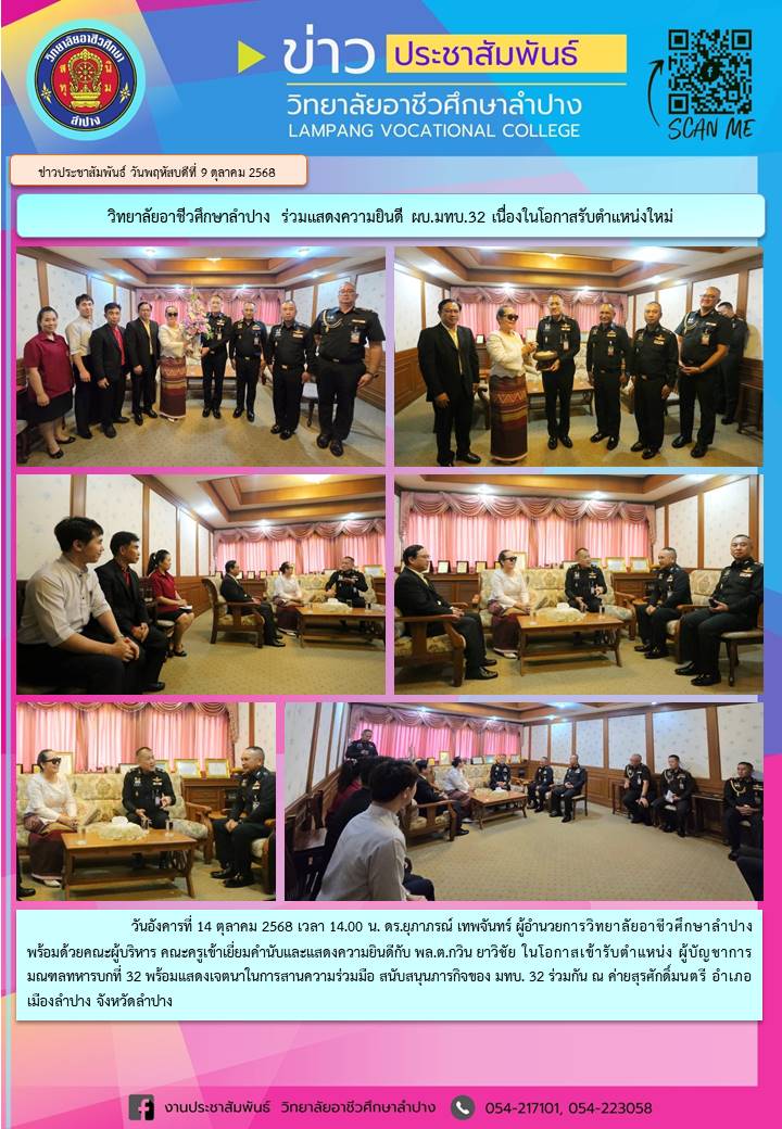 วันอังคารที่ 14 ตุลาคม 2568 เวลา 14.00 น. ดร.ยุภาภรณ์ เทพจันทร์ ผู้อำนวยการวิทยาลัยอาชีวศึกษาลำปาง พร้อมด้วยคณะผู้บริหาร คณะครูเข้าเยี่ยมคำนับและแสดงความยินดีกับ พล.ต.กวิน ยาวิชัย ในโอกาสเข้ารับตำแหน่ง ผู้บัญชาการมณฑลทหารบกที่ 32 พร้อมแสดงเจตนาในการสานความร่วมมือ สนับสนุนภารกิจของ มทบ. 32 ร่วมกัน ณ ค่ายสุรศักดิ์มนตรี อำเภอเมืองลำปาง จังหวัดลำปาง