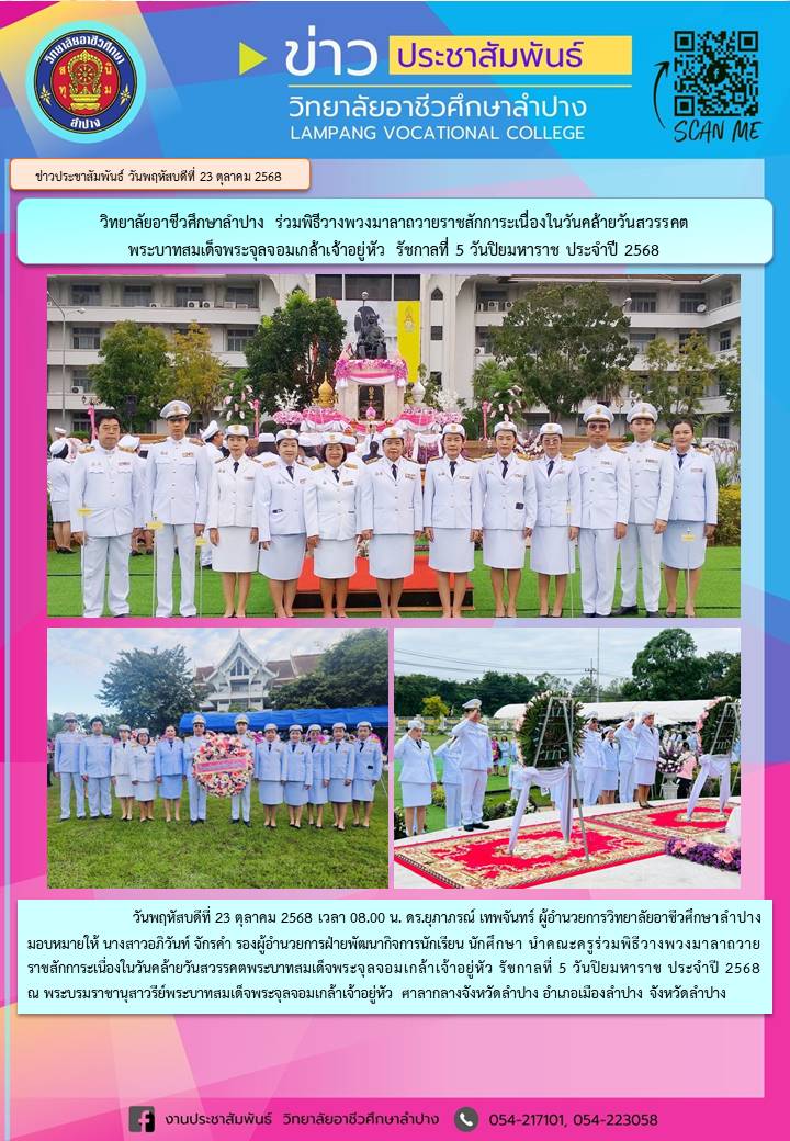 วันพฤหัสบดีที่ 23 ตุลาคม 2568 เวลา 08.00 น. ดร.ยุภาภรณ์ เทพจันทร์ ผู้อำนวยการวิทยาลัยอาชีวศึกษาลำปาง มอบหมายให้ นางสาวอภิวันท์ จักรคำ รองผู้อำนวยการฝ่ายพัฒนากิจการนักเรียน นักศึกษา นำคณะครูร่วมพิธีวางพวงมาลาถวายราชสักการะเนื่องในวันคล้ายวันสวรรคตพระบาทสมเด็จพระจุลจอมเกล้าเจ้าอยู่หัว รัชกาลที่ 5 วันปิยมหาราช ประจำปี 2568 ณ พระบรมราชานุสาวรีย์พระบาทสมเด็จพระจุลจอมเกล้าเจ้าอยู่หัว ศาลากลางจังหวัดลำปาง อำเภอเมืองลำปาง จังหวัดลำปาง