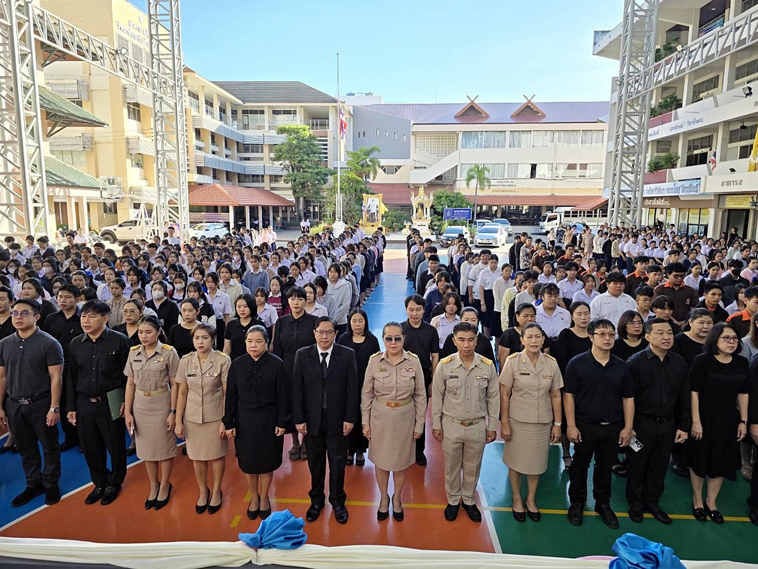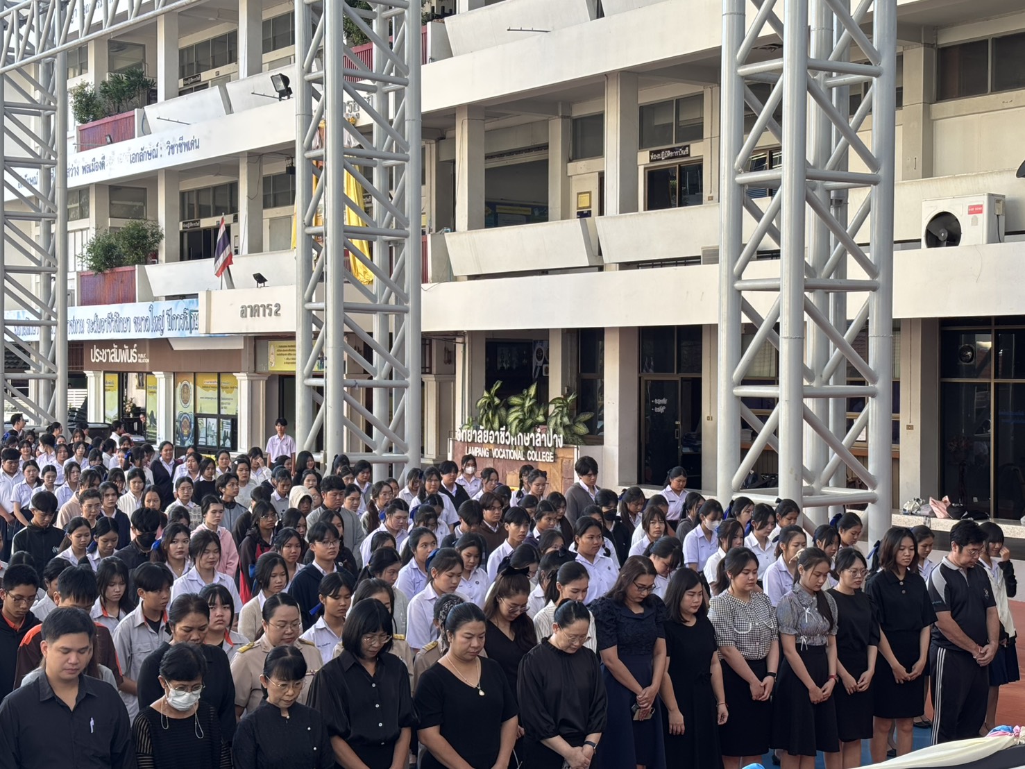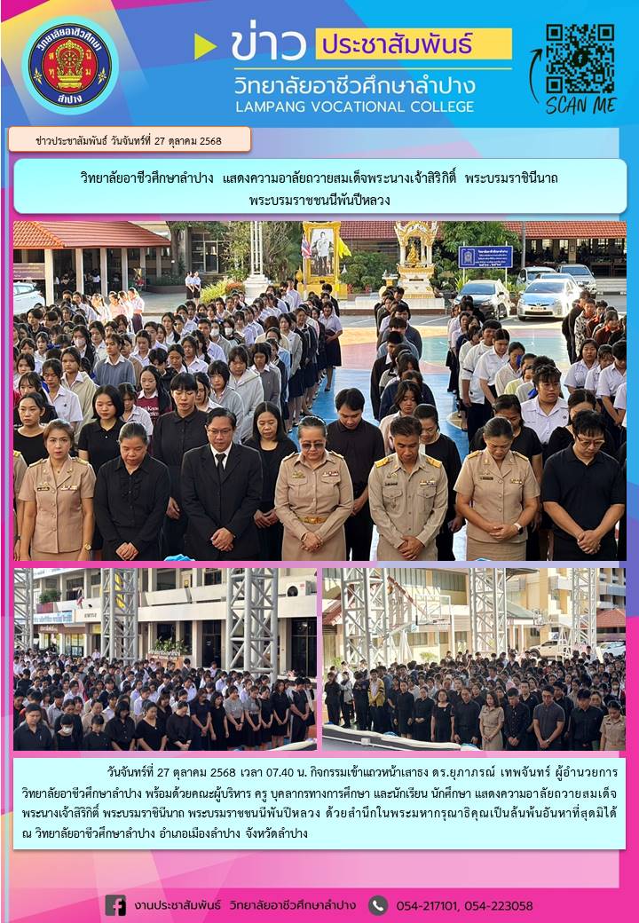 วันจันทร์ที่ 27 ตุลาคม 2568 เวลา 07.40 น. กิจกรรมเข้าแถวหน้าเสาธง ดร.ยุภาภรณ์ เทพจันทร์ ผู้อำนวยการวิทยาลัยอาชีวศึกษาลำปาง พร้อมด้วยคณะผู้บริหาร ครู บุคลากรทางการศึกษา และนักเรียน นักศึกษา แสดงความอาลัยถวายสมเด็จพระนางเจ้าสิริกิติ์ พระบรมราชินีนาถ พระบรมราชชนนีพันปีหลวง ด้วยสำนึกในพระมหากรุณาธิคุณเป็นล้นพ้นอันหาที่สุดมิได้ ณ วิทยาลัยอาชีวศึกษาลำปาง อำเภอเมืองลำปาง จังหวัดลำปาง