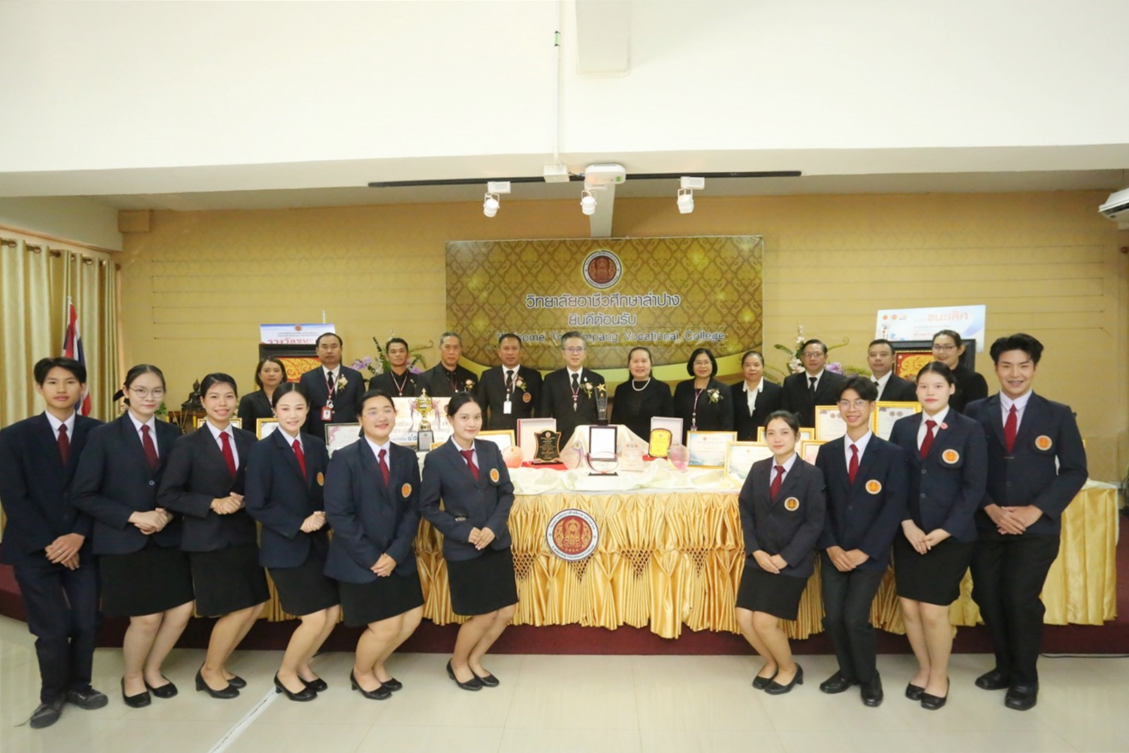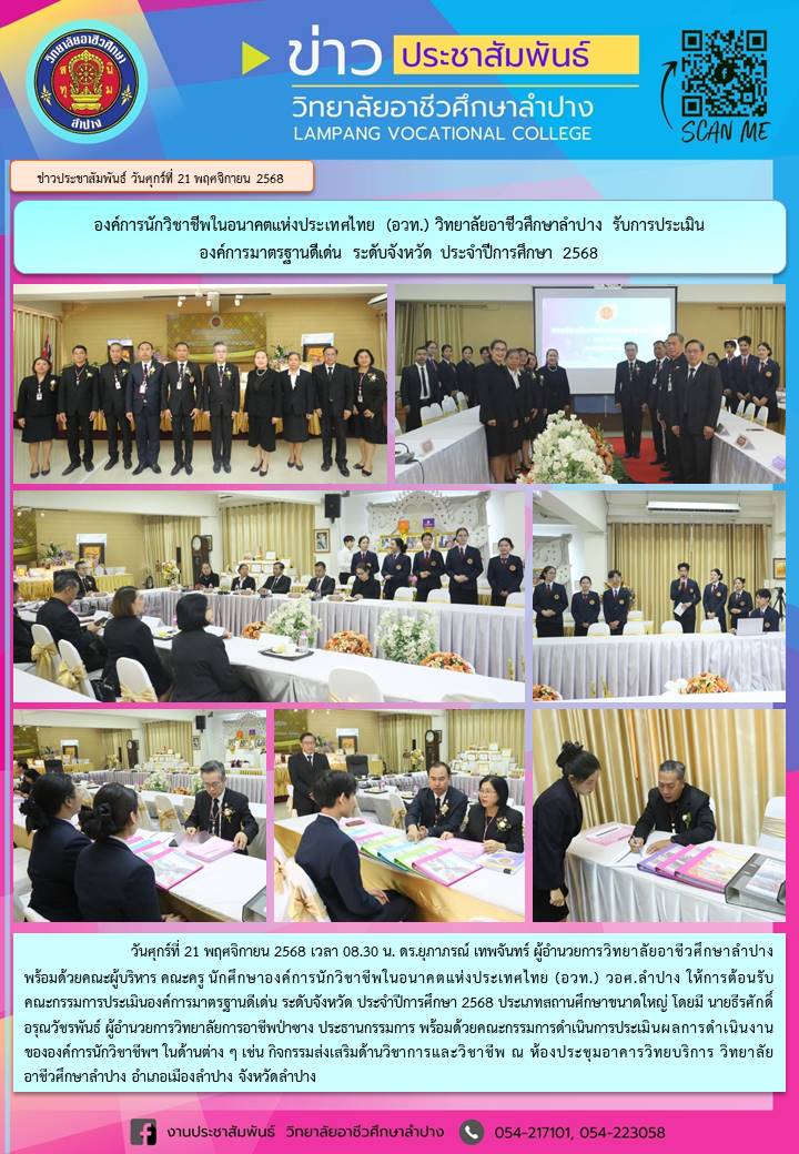 วันศุกร์ที่ 21 พฤศจิกายน 2568 เวลา 08.30 น. ดร.ยุภาภรณ์ เทพจันทร์ ผู้อำนวยการวิทยาลัยอาชีวศึกษาลำปาง พร้อมด้วยคณะผู้บริหาร คณะครู นักศึกษาองค์การนักวิชาชีพในอนาคตแห่งประเทศไทย (อวท.) วอศ.ลำปาง ให้การต้อนรับคณะกรรมการประเมินองค์การมาตรฐานดีเด่น ระดับจังหวัด ประจำปีการศึกษา 2568 ประเภทสถานศึกษาขนาดใหญ่ โดยมี นายธีรศักดิ์ อรุณวัชรพันธ์ ผู้อำนวยการวิทยาลัยการอาชีพป่าซาง ประธานกรรมการ พร้อมด้วยคณะกรรมการดำเนินการประเมินผลการดำเนินงานขององค์การนักวิชาชีพฯ ในด้านต่าง ๆ เช่น กิจกรรมส่งเสริมด้านวิชาการและวิชาชีพณ ห้องประชุมอาคารวิทยบริการ วิทยาลัยอาชีวศึกษาลำปาง อำเภอเมืองลำปาง จังหวัดลำปาง