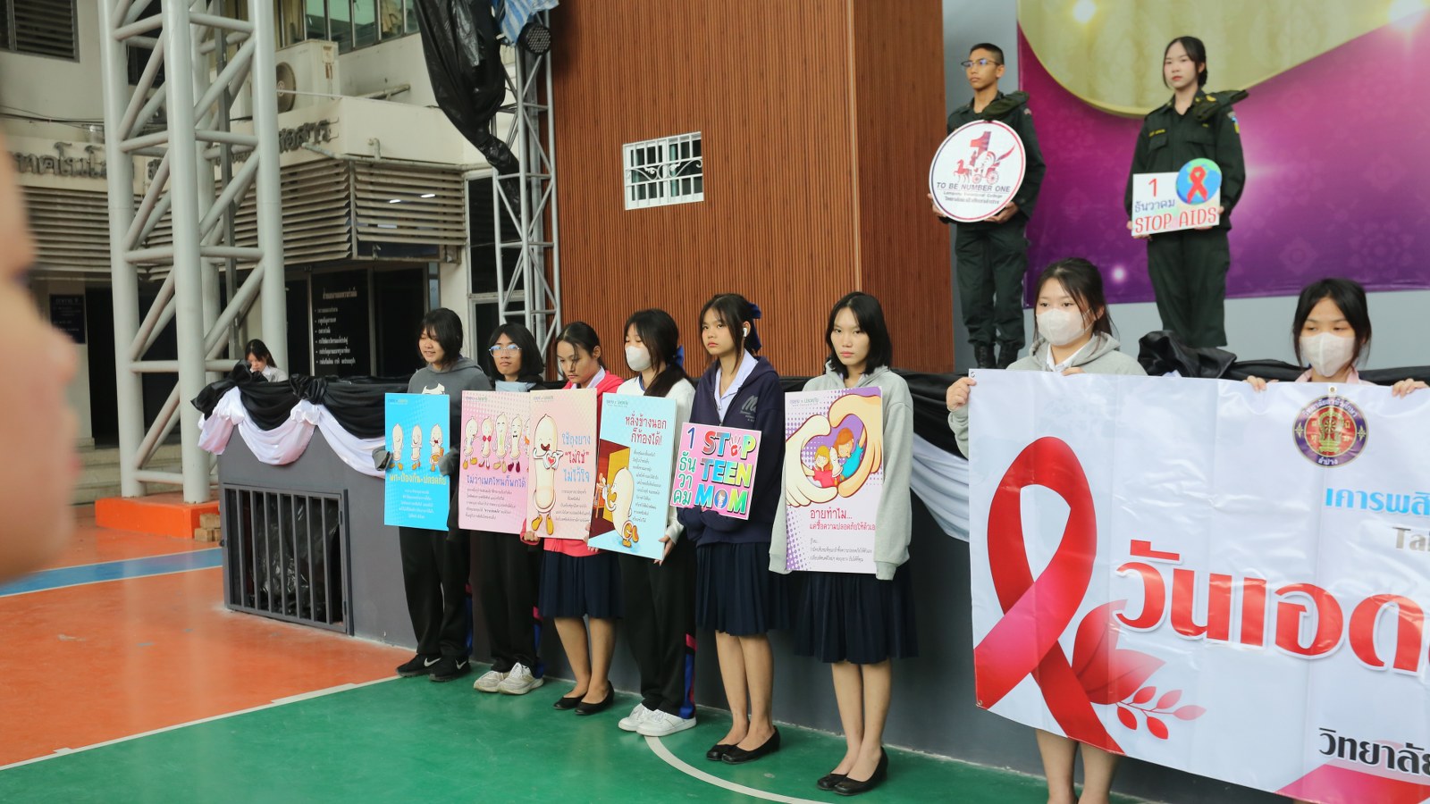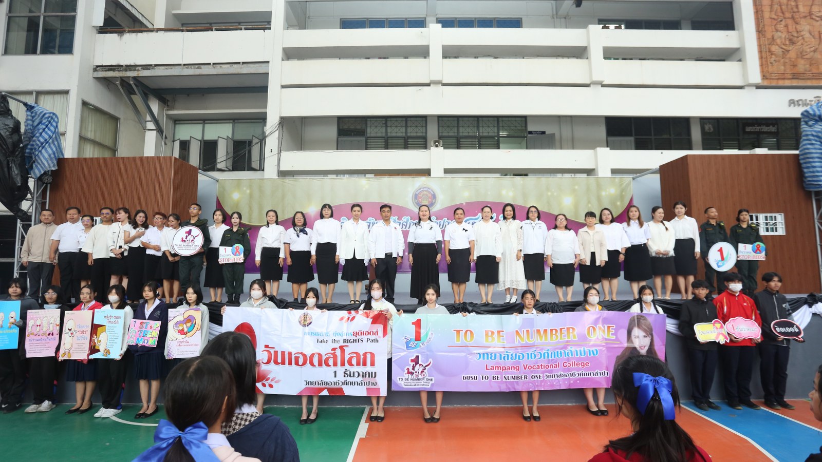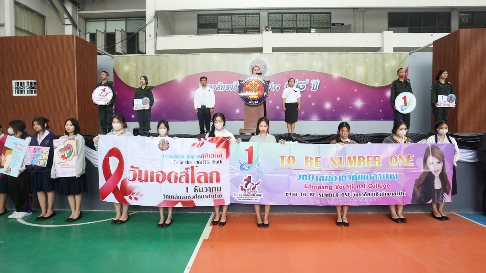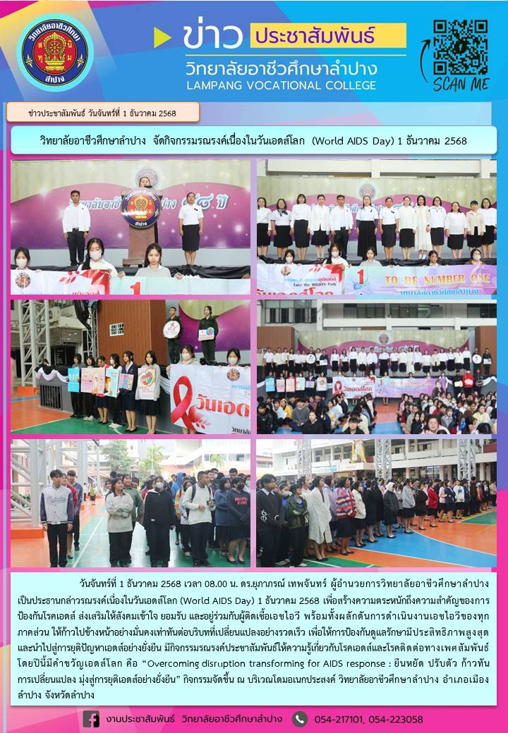วันจันทร์ที่ 1 ธันวาคม 2568 เวลา 08.00 น.ดร.ยุภาภรณ์ เทพจันทร์ ผู้อำนวยการวิทยาลัยอาชีวศึกษาลำปาง เป็นประธานกล่าวรณรงค์เนื่องในวันเอดส์โลก (World AIDS Day) 1 ธันวาคม 2568 เพื่อสร้างความตระหนักถึงความสำคัญของการป้องกันโรคเอดส์ ส่งเสริมให้สังคมเข้าใจ ยอมรับ และอยู่ร่วมกับผู้ติดเชื้อเอชไอวี พร้อมทั้งผลักดันการดำเนินงานเอชไอวีของทุกภาคส่วน ให้ก้าวไปข้างหน้าอย่างมั่นคงเท่าทันต่อบริบทที่เปลี่ยนแปลงอย่างรวดเร็ว เพื่อให้การป้องกันดูแลรักษามีประสิทธิภาพสูงสุด และนำไปสู่การยุติปัญหาเอดส์อย่างยั่งยืน มีกิจกรรมรณรงค์ประชาสัมพันธ์ให้ความรู้เกี่ยวกับโรคเอดส์และโรคติดต่อทางเพศสัมพันธ์ โดยปีนี้มีคำขวัญเอดส์โลก คือ “Overcoming disruption transforming for AIDS response : ยืนหยัด ปรับตัว ก้าวทันการเปลี่ยนแปลง มุ่งสู่การยุติเอดส์อย่างยั่งยืน”กิจกรรมจัดขึ้น ณ บริเวณโดมอเนกประสงค์ วิทยาลัยอาชีวศึกษาลำปาง อำเภอเมืองลำปาง จังหวัดลำปาง