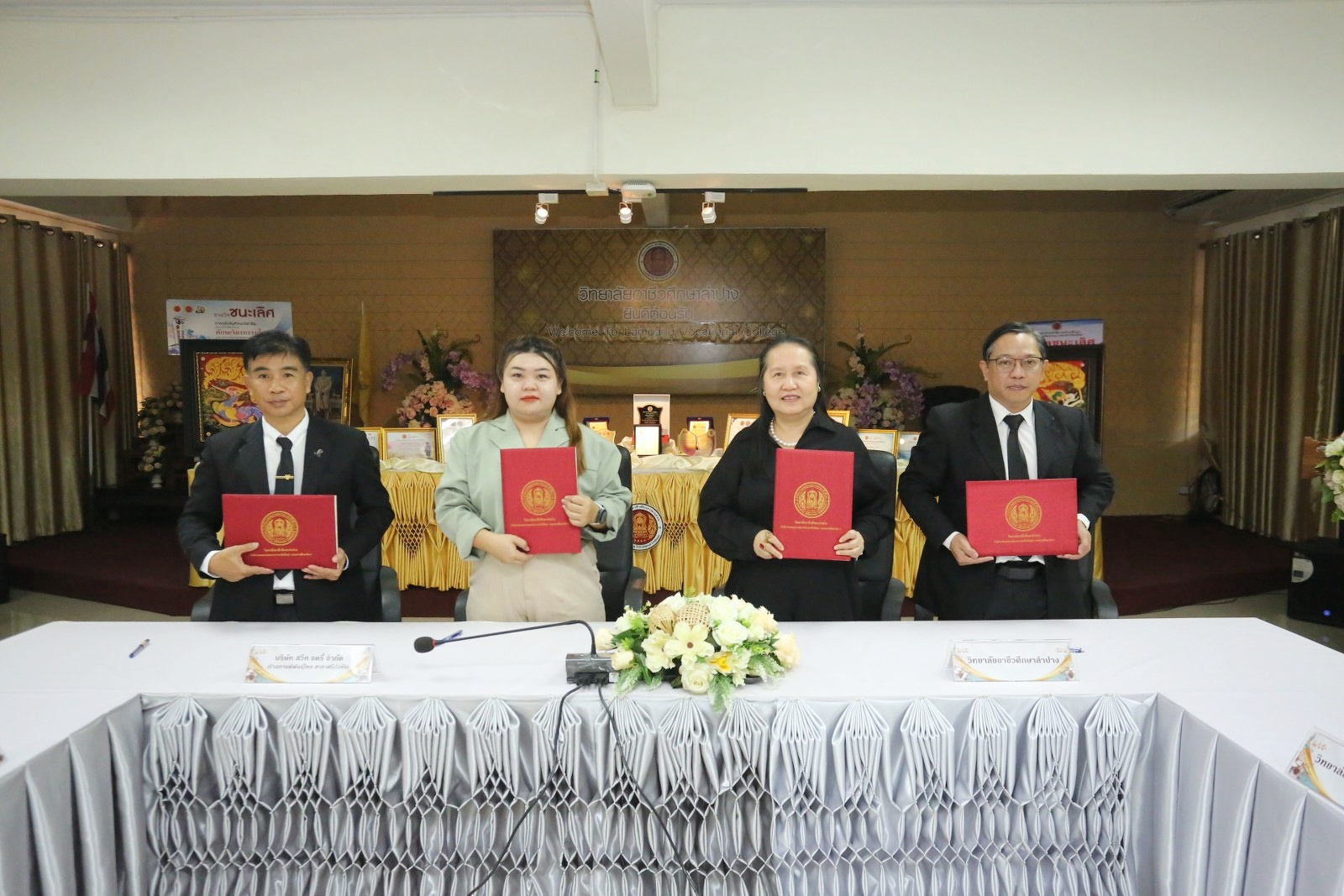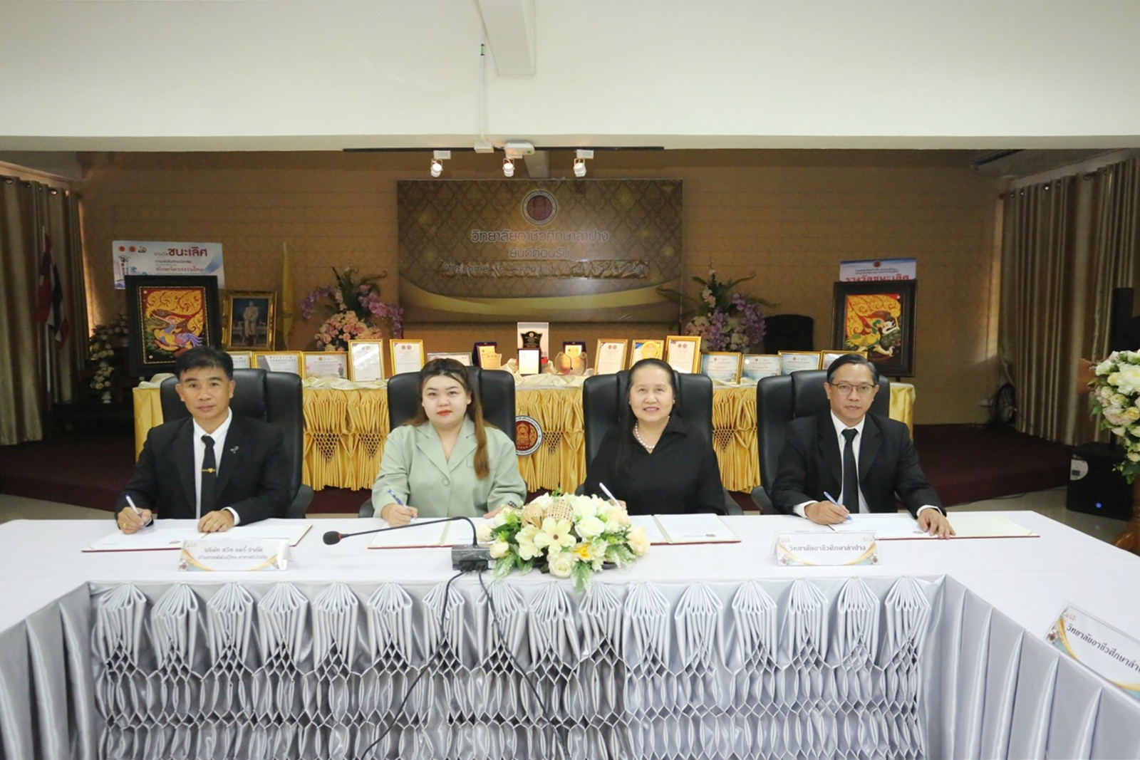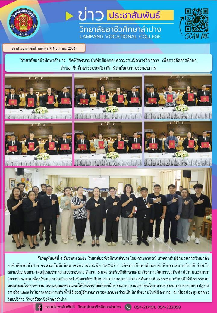 วันพฤหัสบดีที่ 4 ธันวาคม 2568 วิทยาลัยอาชีวศึกษาลำปาง โดย ดร.ยุภาภรณ์ เทพจันทร์ ผู้อำนวยการวิทยาลัยอาชีวศึกษาลำปาง ลงนามบันทึกข้อตกลงความร่วมมือ (MOU) การจัดการศึกษาด้านอาชีวศึกษาระบบทวิภาคี ร่วมกับสถานประกอบการ โดยผู้แทนจากสถานประกอบการ จำนวน 6 แห่ง ดังนี้ ร้านป้าปี๋ คอฟฟี่, ร้านข้าวต้มอร่อยบาทเดียว, บริษัท นอร์ทเทอร์นสยาม ซีดแลค จำกัด, บริษัท ยูคลาวด์ จำกัด, บริษัท สวีท แดรี่ จำกัด (ร้านกาแฟพันธุ์ไทย สาขาศรีปงชัย) และบริษัท เกษมกิจ จำกัด ซึ่งเป็นบันทึกข้อตกลงสำหรับนักศึกษาแผนกวิชาการจัดการธุรกิจค้าปลีก และแผนกวิชาการโรงแรม เพื่อสร้างความร่วมมือระหว่างวิทยาลัยฯ กับสถานประกอบการในการจัดการศึกษาระบบทวิภาคีให้มีสมรรถนะที่เหมาะสมในการทำงาน สนับสนุนและส่งเสริมให้นักเรียน นักศึกษาฝึกประสบการณ์วิชาชีพในสถานประกอบการจากการปฏิบัติงานจริง และสร้างโอกาสการมีงานทำ ทั้งนี้ มีรองผู้อำนวยการ วอศ.ลำปาง ร่วมเป็นสักขีพยานในพิธีลงนาม ณ ห้องประชุมอาคารวิทยบริการ วิทยาลัยอาชีวศึกษาลำปาง