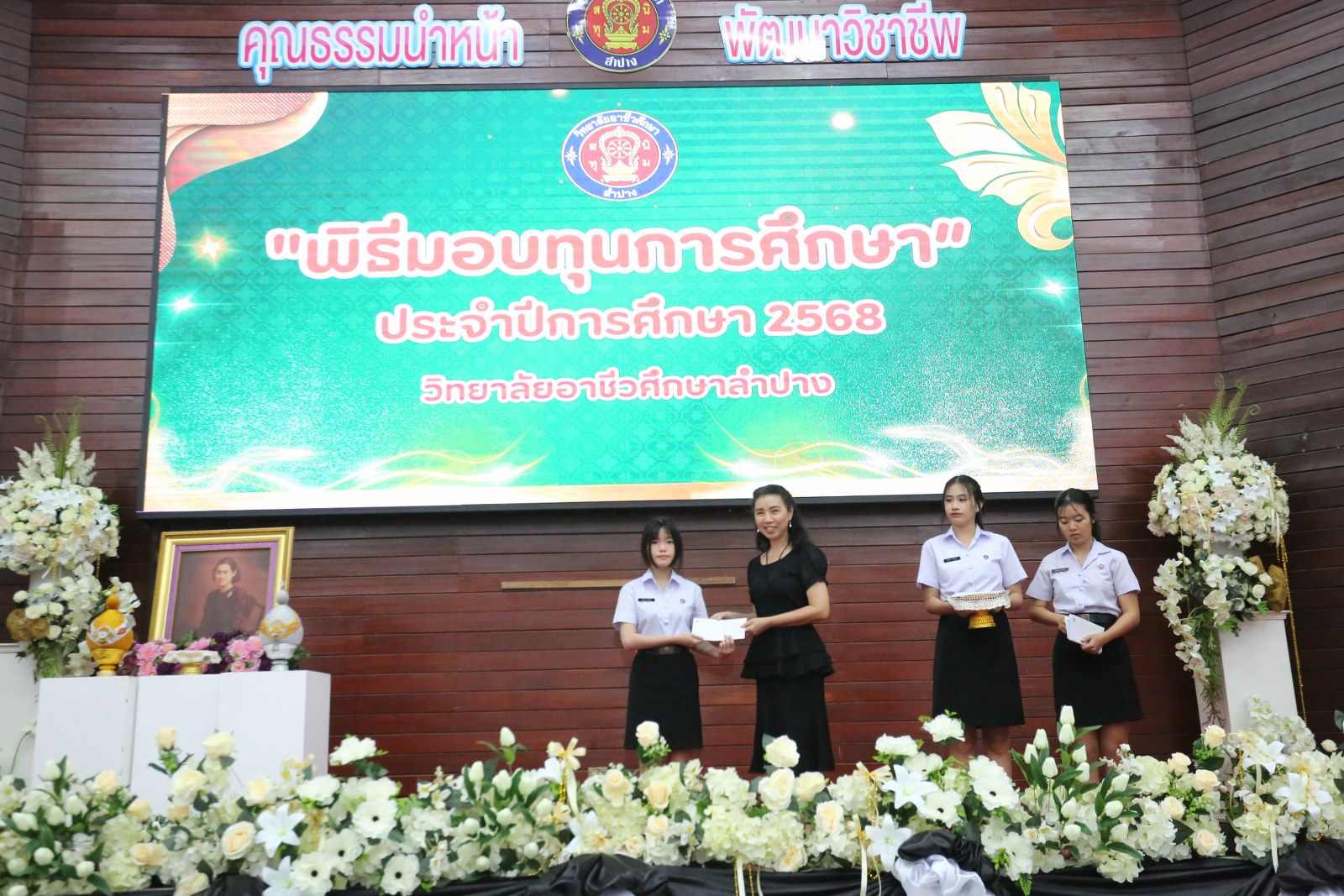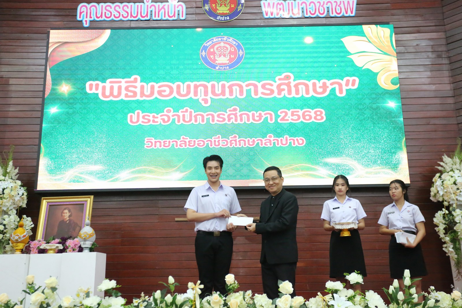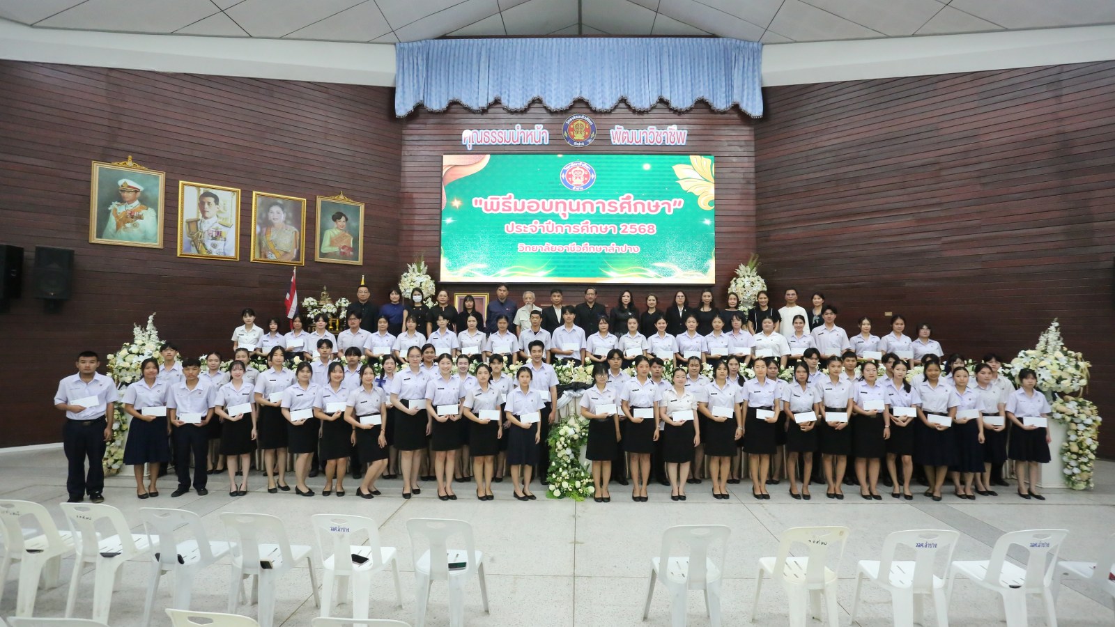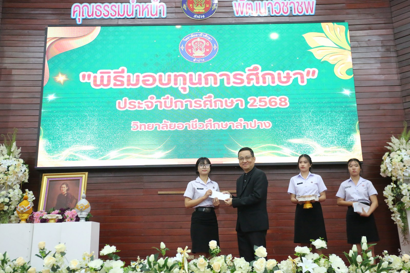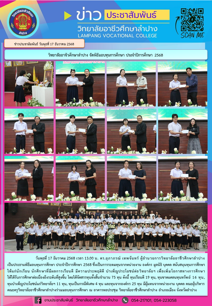 วันพุธที่ 17 ธันวาคม 2568 เวลา 13.00 น. ดร.ยุภาภรณ์ เทพจันทร์ ผู้อำนวยการวิทยาลัยอาชีวศึกษาลำปาง เป็นประธานพิธีมอบทุนการศึกษา ประจำปีการศึกษา 2568ซึ่งเป็นการระดมทุนจากหน่วยงาน องค์กร มูลนิธิ บุคคล สนับสนุนทุนการศึกษาให้แก่นักเรียน นักศึกษาที่มีผลการเรียนดี มีความประพฤติดี บำเพ็ญประโยชน์ต่อวิทยาลัยฯ เพื่อเพิ่มโอกาสทางการศึกษาให้ได้รับการศึกษาต่อเนื่องถึงระดับที่สูงขึ้น โดยได้จัดสรรทุนทั้งสิ้นจำนวน 75 ทุน ดังนี้ ทุนเรียนดี 19 ทุน, ทุนขาดแคลนทุนทรัพย์ 16 ทุน, ทุนบำเพ็ญประโยชน์แก่วิทยาลัยฯ 11 ทุน, ทุนเป็นกรณีพิเศษ 4 ทุน และทุนจากองค์กร 25 ทุน มีผู้แทนจากหน่วยงาน บุคคล คณะผู้บริหาร คณะครูวิทยาลัยอาชีวศึกษาลำปางร่วมมอบทุนการศึกษา ณ อาคารหอประชุม วิทยาลัยอาชีวศึกษาลำปาง อำเภอเมือง จังหวัดลำปาง