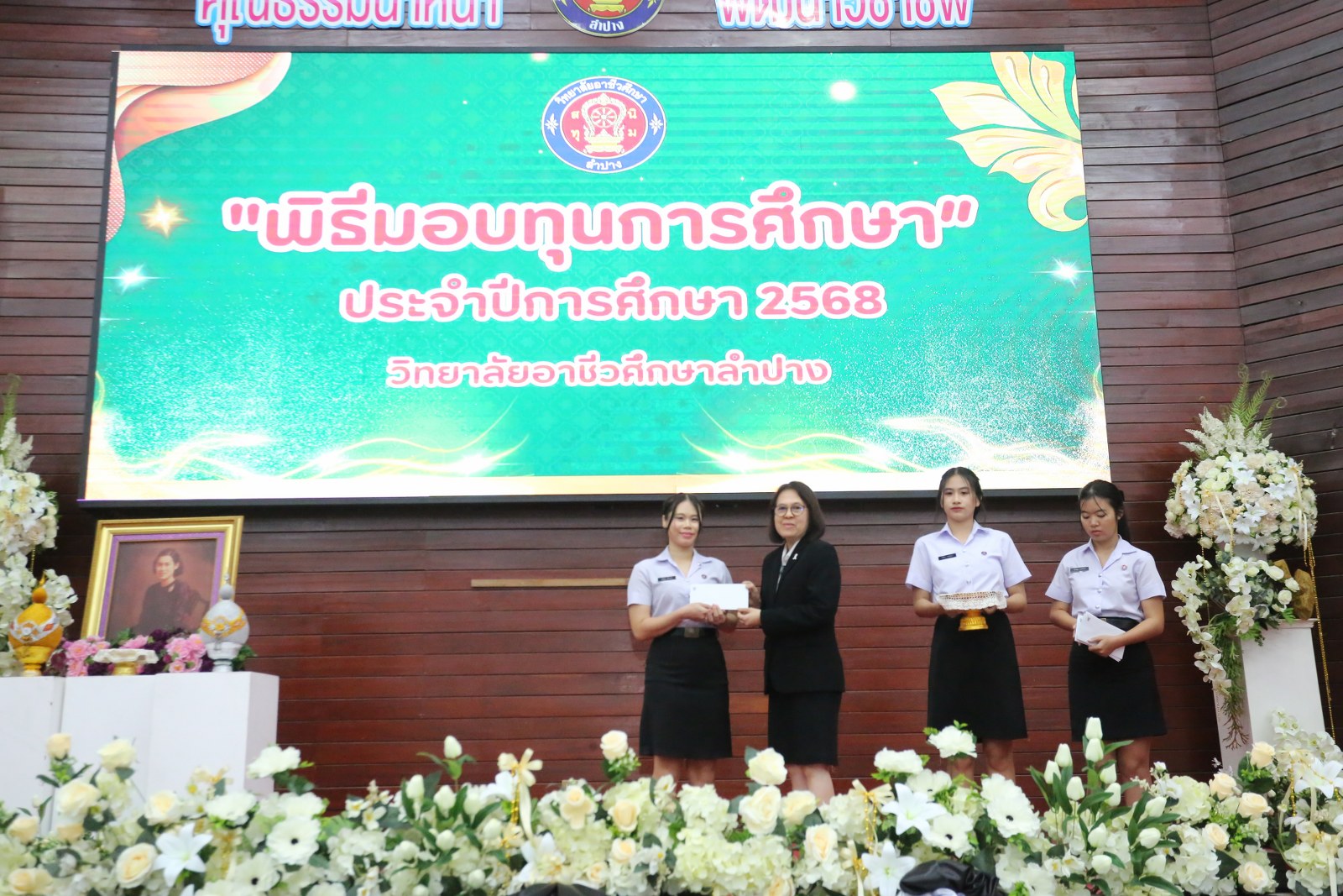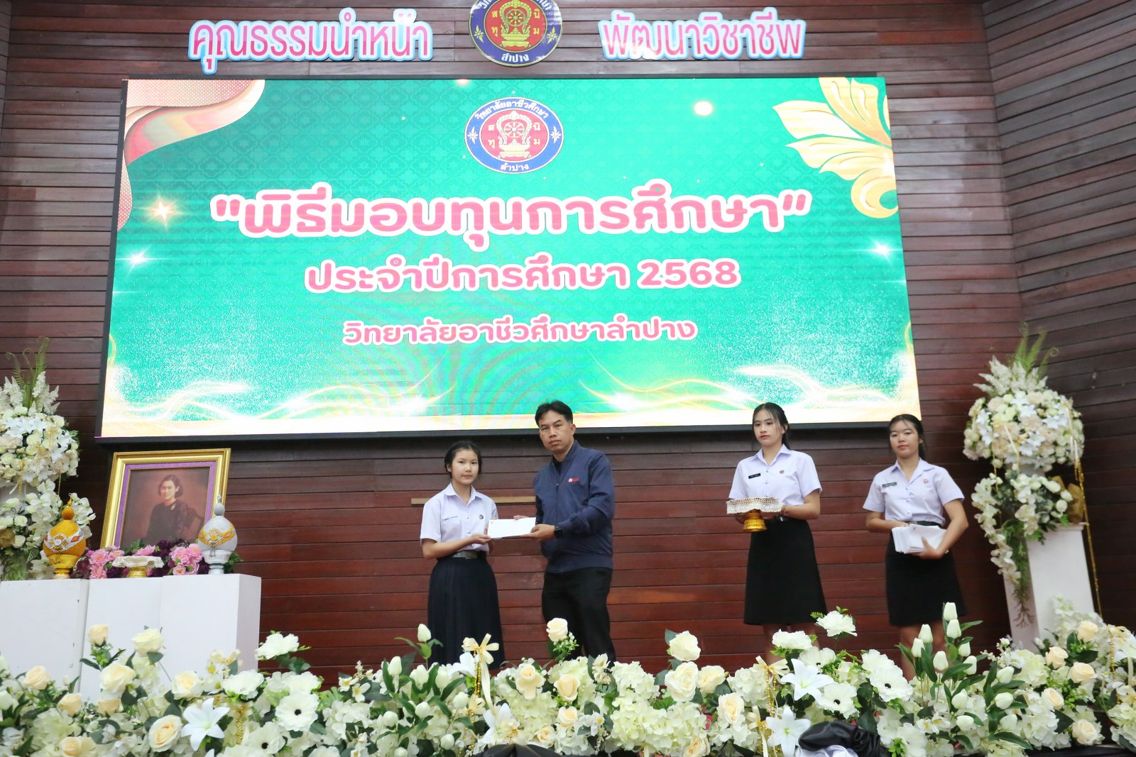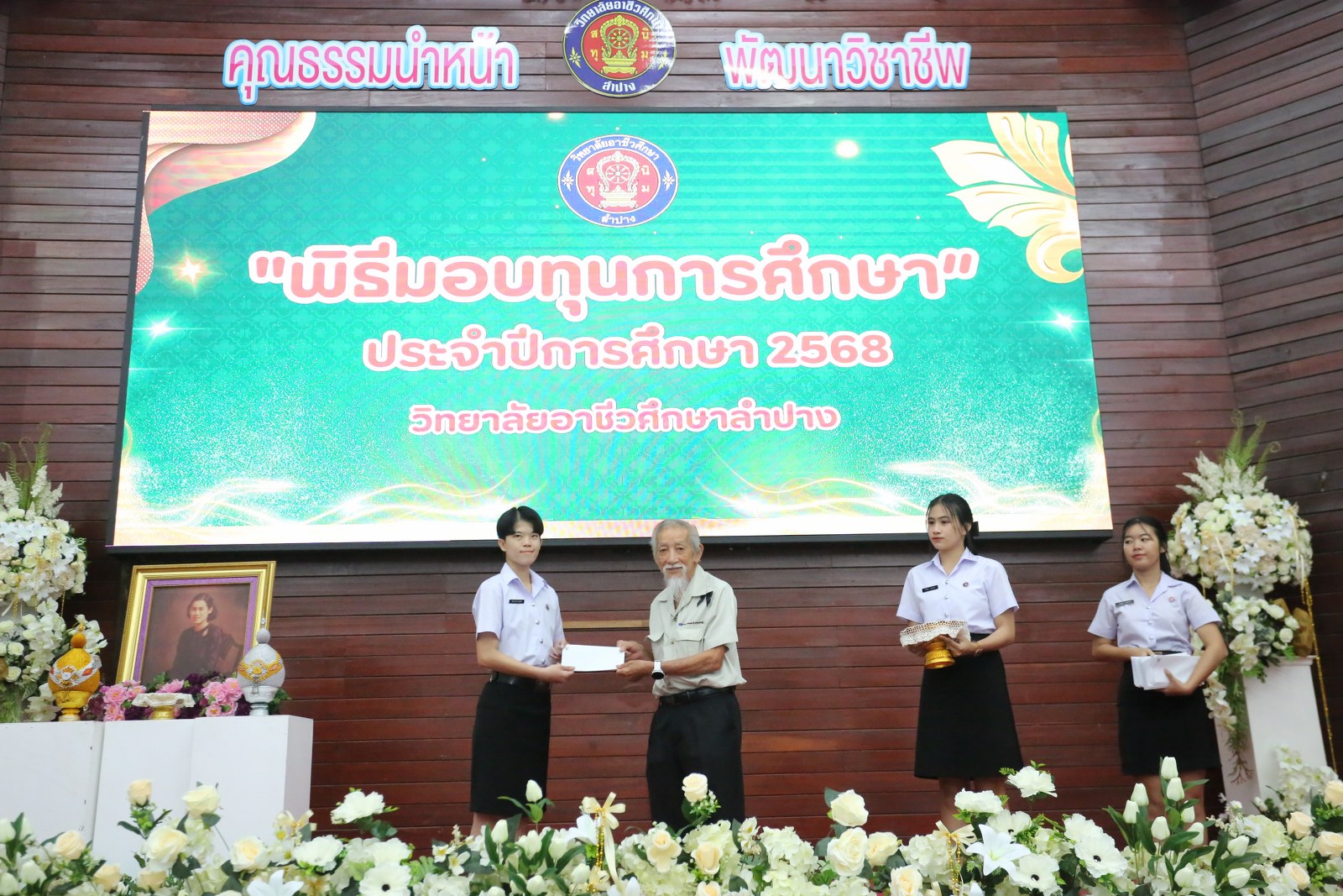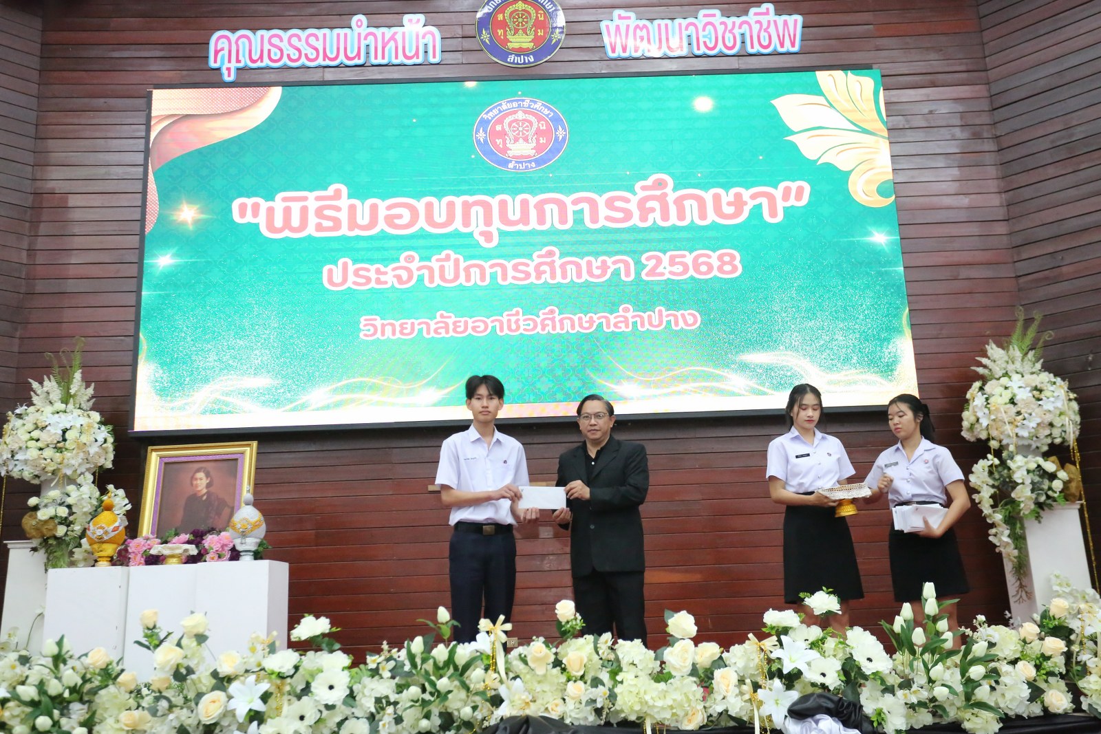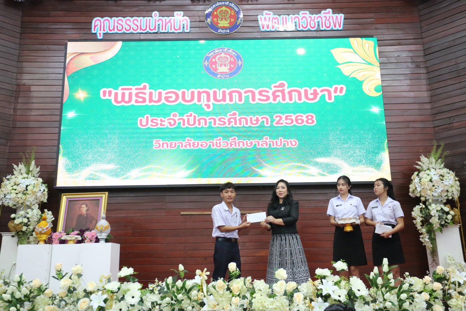 วันพุธที่ 17 ธันวาคม 2568 เวลา 13.00 น. ดร.ยุภาภรณ์ เทพจันทร์ ผู้อำนวยการวิทยาลัยอาชีวศึกษาลำปาง เป็นประธานพิธีมอบทุนการศึกษา ประจำปีการศึกษา 2568ซึ่งเป็นการระดมทุนจากหน่วยงาน องค์กร มูลนิธิ บุคคล สนับสนุนทุนการศึกษาให้แก่นักเรียน นักศึกษาที่มีผลการเรียนดี มีความประพฤติดี บำเพ็ญประโยชน์ต่อวิทยาลัยฯ เพื่อเพิ่มโอกาสทางการศึกษาให้ได้รับการศึกษาต่อเนื่องถึงระดับที่สูงขึ้น โดยได้จัดสรรทุนทั้งสิ้นจำนวน 75 ทุน ดังนี้ ทุนเรียนดี 19 ทุน, ทุนขาดแคลนทุนทรัพย์ 16 ทุน, ทุนบำเพ็ญประโยชน์แก่วิทยาลัยฯ 11 ทุน, ทุนเป็นกรณีพิเศษ 4 ทุน และทุนจากองค์กร 25 ทุน มีผู้แทนจากหน่วยงาน บุคคล คณะผู้บริหาร คณะครูวิทยาลัยอาชีวศึกษาลำปางร่วมมอบทุนการศึกษา ณ อาคารหอประชุม วิทยาลัยอาชีวศึกษาลำปาง อำเภอเมือง จังหวัดลำปาง