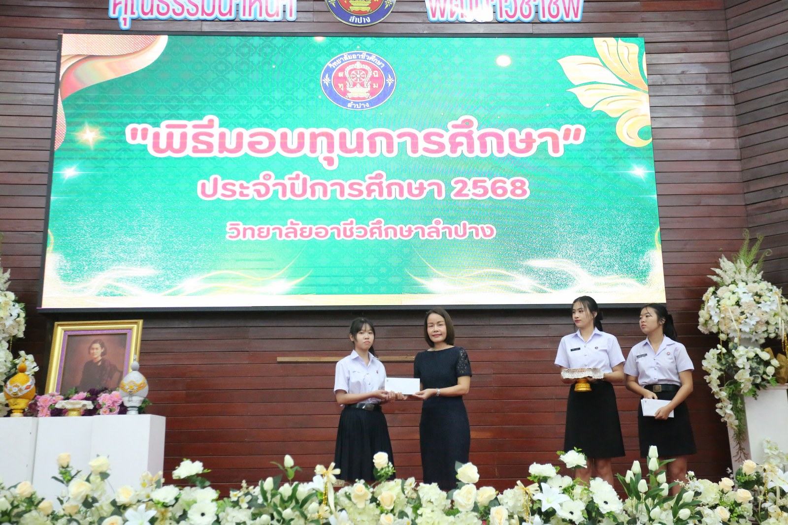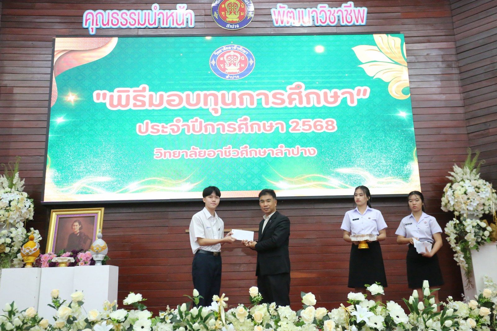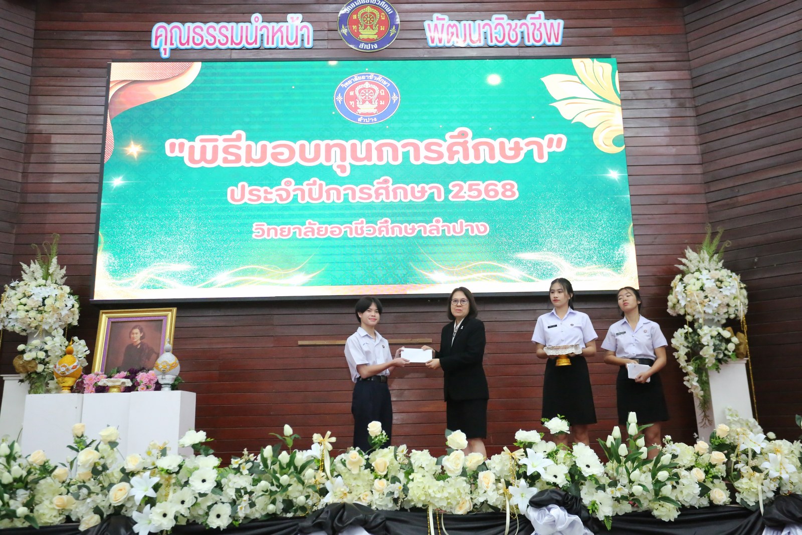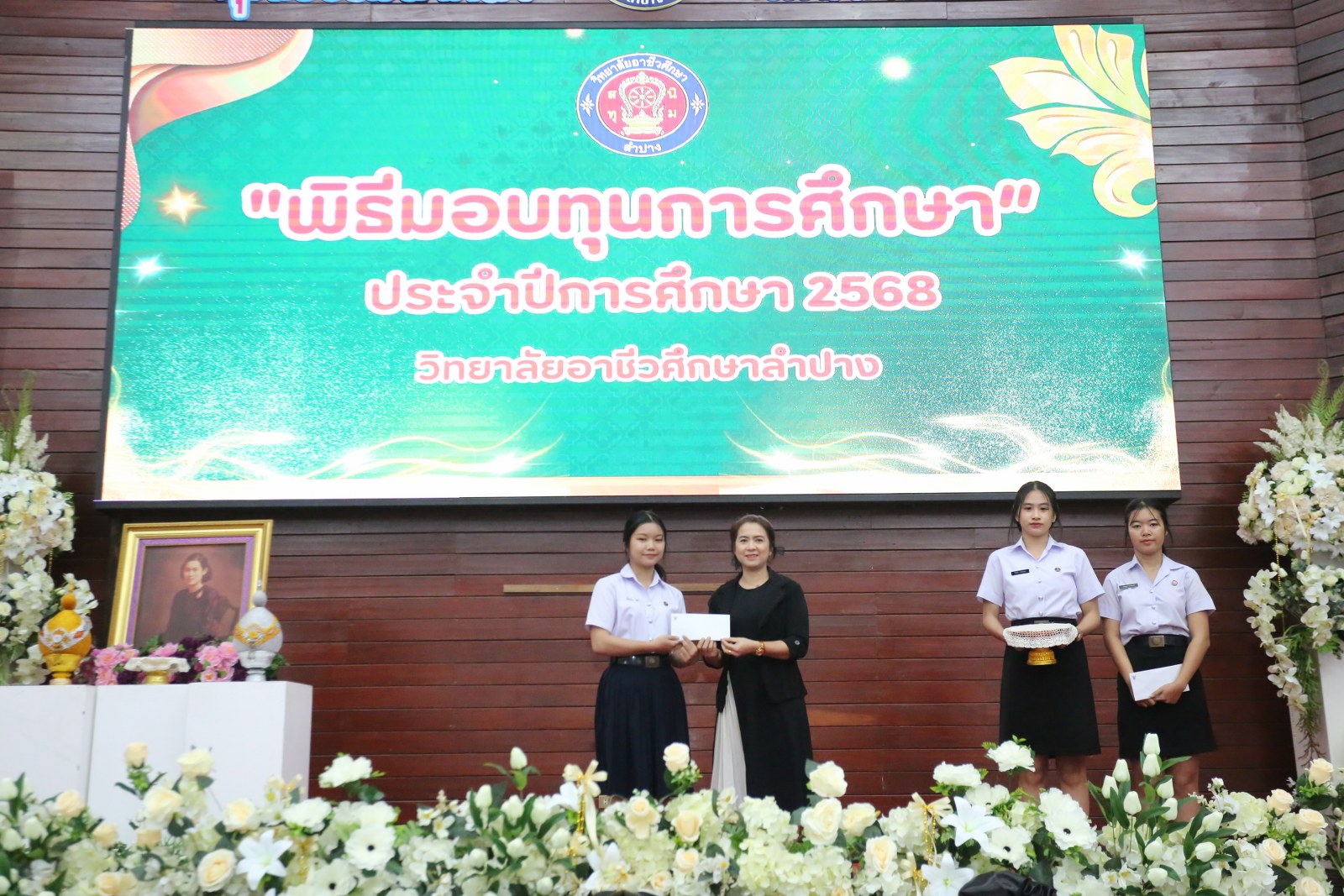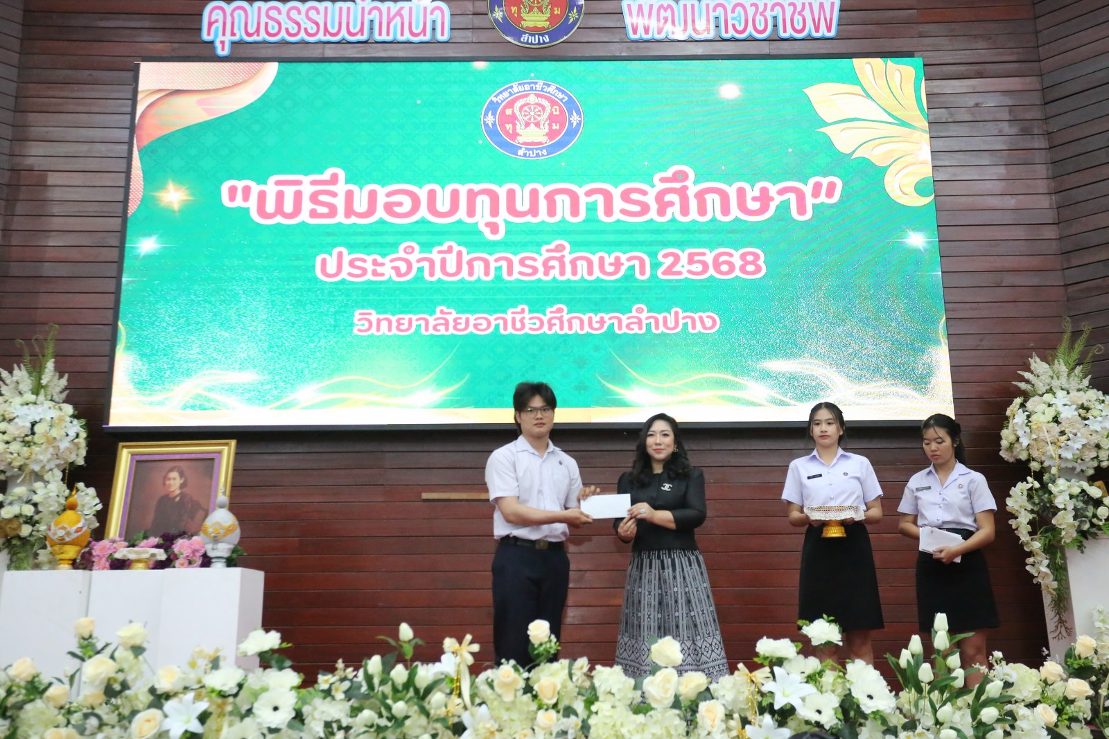วันพุธที่ 17 ธันวาคม 2568 เวลา 13.00 น. ดร.ยุภาภรณ์ เทพจันทร์ ผู้อำนวยการวิทยาลัยอาชีวศึกษาลำปาง เป็นประธานพิธีมอบทุนการศึกษา ประจำปีการศึกษา 2568ซึ่งเป็นการระดมทุนจากหน่วยงาน องค์กร มูลนิธิ บุคคล สนับสนุนทุนการศึกษาให้แก่นักเรียน นักศึกษาที่มีผลการเรียนดี มีความประพฤติดี บำเพ็ญประโยชน์ต่อวิทยาลัยฯ เพื่อเพิ่มโอกาสทางการศึกษาให้ได้รับการศึกษาต่อเนื่องถึงระดับที่สูงขึ้น โดยได้จัดสรรทุนทั้งสิ้นจำนวน 75 ทุน ดังนี้ ทุนเรียนดี 19 ทุน, ทุนขาดแคลนทุนทรัพย์ 16 ทุน, ทุนบำเพ็ญประโยชน์แก่วิทยาลัยฯ 11 ทุน, ทุนเป็นกรณีพิเศษ 4 ทุน และทุนจากองค์กร 25 ทุน มีผู้แทนจากหน่วยงาน บุคคล คณะผู้บริหาร คณะครูวิทยาลัยอาชีวศึกษาลำปางร่วมมอบทุนการศึกษา ณ อาคารหอประชุม วิทยาลัยอาชีวศึกษาลำปาง อำเภอเมือง จังหวัดลำปาง