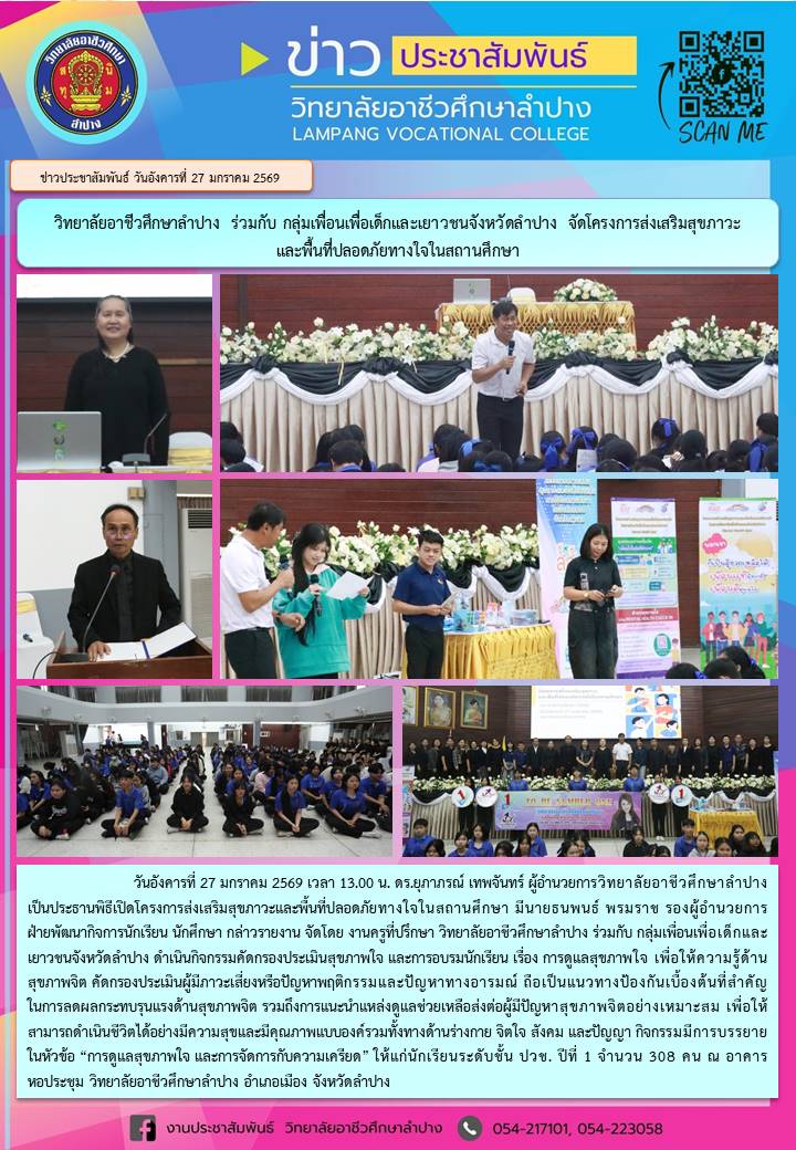 วันอังคารที่ 27 มกราคม 2569 เวลา 13.00 น. ดร.ยุภาภรณ์ เทพจันทร์ ผู้อำนวยการวิทยาลัยอาชีวศึกษาลำปาง เป็นประธานพิธีเปิดโครงการส่งเสริมสุขภาวะและพื้นที่ปลอดภัยทางใจในสถานศึกษา มีนายธนพนธ์ พรมราช รองผู้อำนวยการฝ่ายพัฒนากิจการนักเรียน นักศึกษา กล่าวรายงาน จัดโดย งานครูที่ปรึกษา วิทยาลัยอาชีวศึกษาลำปาง ร่วมกับ กลุ่มเพื่อนเพื่อเด็กและเยาวชนจังหวัดลำปาง ดำเนินกิจกรรมคัดกรองประเมินสุขภาพใจ และการอบรมนักเรียน เรื่อง การดูแลสุขภาพใจ เพื่อให้ความรู้ด้านสุขภาพจิต คัดกรองประเมินผู้มีภาวะเสี่ยงหรือปัญหาพฤติกรรมและปัญหาทางอารมณ์ ถือเป็นแนวทางป้องกันเบื้องต้นที่สำคัญในการลดผลกระทบรุนแรงด้านสุขภาพจิต รวมถึงการแนะนำแหล่งดูแลช่วยเหลือส่งต่อผู้มีปัญหาสุขภาพจิตอย่างเหมาะสม เพื่อให้สามารถดำเนินชีวิตได้อย่างมีความสุขและมีคุณภาพแบบองค์รวมทั้งทางด้านร่างกาย จิตใจ สังคม และปัญญา กิจกรรมมีการบรรยายในหัวข้อ “การดูแลสุขภาพใจ และการจัดการกับความเครียด” ให้แก่นักเรียนระดับชั้น ปวช. ปีที่ 1 จำนวน 308 คน