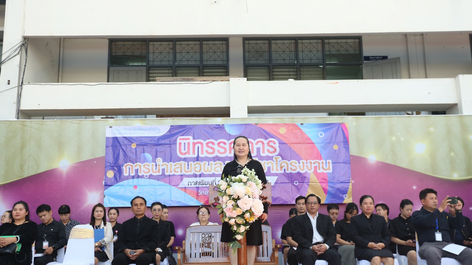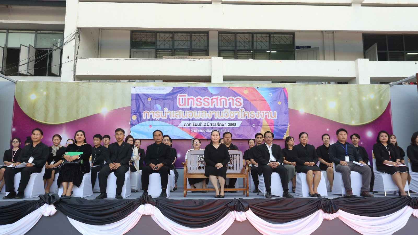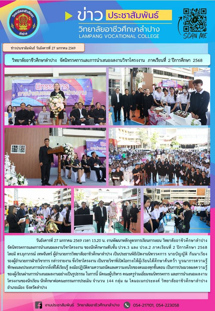 วันอังคารที่ 27 มกราคม 2569 เวลา 13.20 น. งานพัฒนาหลักสูตรการเรียนการสอน วิทยาลัยอาชีวศึกษาลำปาง จัดนิทรรศการและการนำเสนอผลงานวิชาโครงงาน ของนักศึกษาระดับชั้น ปวช.3 และ ปวส.2 ภาคเรียนที่ 2 ปีการศึกษา 2568 โดยมี ดร.ยุภาภรณ์ เทพจันทร์ ผู้อำนวยการวิทยาลัยอาชีวศึกษาลำปาง เป็นประธานพิธีเปิดงานนิทรรศการ นายบัญญัติ กันมาเวียง รองผู้อำนวยการฝ่ายวิชาการ กล่าวรายงาน ซึ่งวิชาโครงงาน เป็นรายวิชาที่เปิดโอกาสให้ผู้เรียนได้ศึกษาค้นคว้า บูรณาการความรู้ ทักษะและประสบการณ์จากสิ่งที่ได้เรียนรู้ ลงมือปฏิบัติตามความถนัดและความสนใจของตนเองทุกขั้นตอน เป็นการประมวลผลความรู้ของผู้เรียนผ่านการนำเสนอผลงานอย่างเป็นรูปธรรม ในการนี้ มีคณะผู้บริหาร คณะครูร่วมเยี่ยมชมนิทรรศการ และการนำเสนอผลงานโครงงานของนักเรียน นักศึกษาต่อคณะกรรมการประเมิน จำนวน 144 กลุ่ม ณ โดมอเนกประสงค์ วิทยาลัยอาชีวศึกษาลำปาง อำเภอเมือง จังหวัดลำปาง