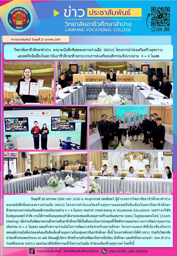วันพุธที่ 28 มกราคม 2569 เวลา 10.00 น. ดร.ยุภาภรณ์ เทพจันทร์ ผู้อำนวยการวิทยาลัยอาชีวศึกษาลำปาง ลงนามบันทึกข้อตกลงความร่วมมือ (MOU) โครงการนำร่องเสริมสร้างสุขภาวะและลดปัจจัยเสี่ยงในสถาบันอาชีวศึกษาด้วยกระบวนการส่งเสริมพฤติกรรมเชิงบวกผ่าน 4 + 6 โมเดล WellVE (Well-being in Vocational Education) ระหว่างบริษัทอินฟลูเอนเซอร์ จำกัด ภายใต้การสนับสนุนของสำนักงานกองทุนสนับสนุนการสร้างเสริมสุขภาพ (สสส.) ในรูปแบบออนไลน์ (Zoom Meeting) เพื่อร่วมกันพัฒนาสถานศึกษาระดับอาชีวศึกษาให้เป็นต้นแบบในการประยุกต์ใช้หลักการและกระบวนการพัฒนาคุณธรรมจริยธรรม (4 + 6 โมเดล) และสร้างความร่วมมือในการพัฒนาเครือข่ายกับสถานศึกษา โครงการและภาคีที่เกี่ยวข้องกับการลดพฤติกรรมไม่พึงประสงค์และปัจจัยเสี่ยงด้านสุขภาวะในกลุ่มสถาบันอาชีวศึกษา ทั้งนี้ โครงการดังกล่าวได้ทำ MOU ร่วมกับวิทยาลัยนำร่องทั่วประเทศจำนวน 60 แห่ง มีคณะผู้บริหาร หัวหน้างานฝ่ายพัฒนากิจการนักเรียน นักศึกษา และนักศึกษาแกนนำ วอศ.ลำปาง ร่วมพิธีลงนาม (MOU)และร่วมเวทีบันทึกความเข้าใจความร่วมมือ นำร่องเสริมสร้างสุขภาวะฯ ในครั้งนี้