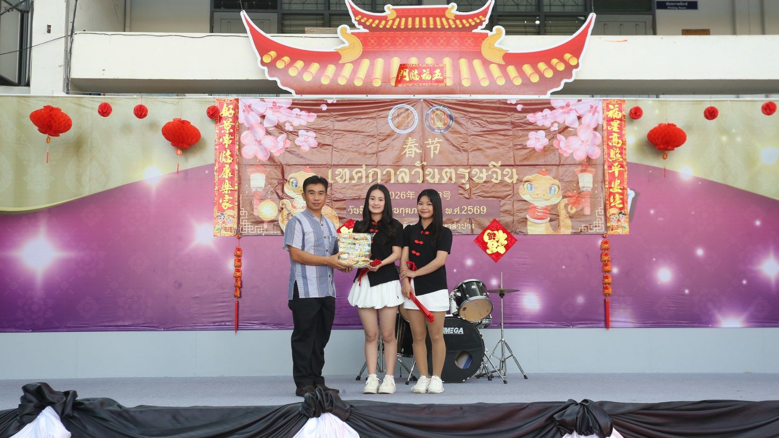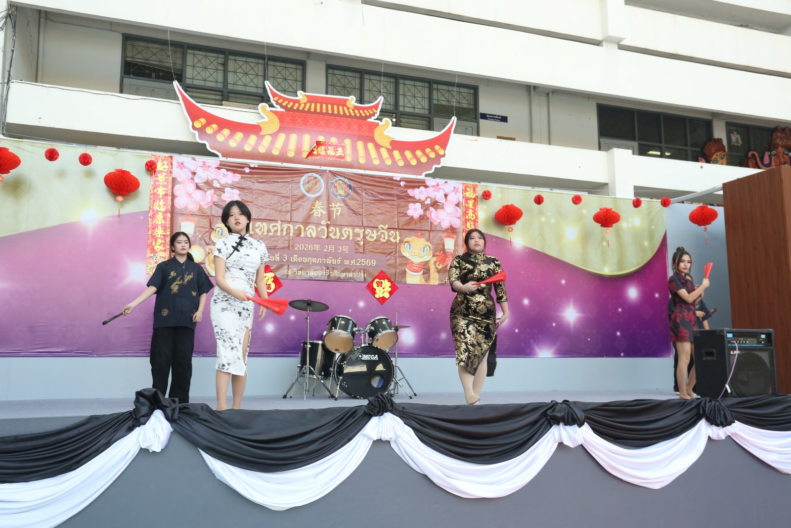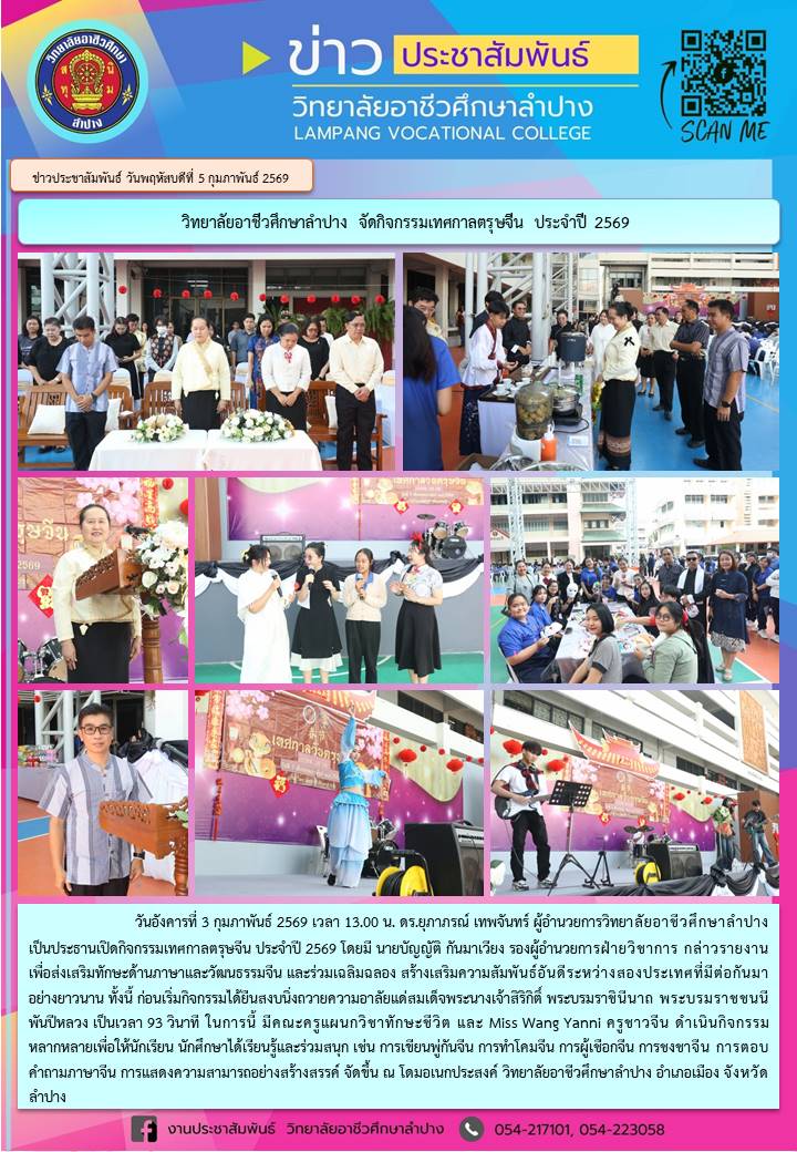 วันอังคารที่ 3 กุมภาพันธ์ 2569 เวลา 13.00 น. ดร.ยุภาภรณ์ เทพจันทร์ ผู้อำนวยการวิทยาลัยอาชีวศึกษาลำปาง เป็นประธานเปิดกิจกรรมเทศกาลตรุษจีน ประจำปี 2569 โดยมี นายบัญญัติ กันมาเวียง รองผู้อำนวยการฝ่ายวิชาการ กล่าวรายงาน เพื่อส่งเสริมทักษะด้านภาษาและวัฒนธรรมจีน และร่วมเฉลิมฉลอง สร้างเสริมความสัมพันธ์อันดีระหว่างสองประเทศที่มีต่อกันมาอย่างยาวนาน ทั้งนี้ ก่อนเริ่มกิจกรรมได้ยืนสงบนิ่งถวายความอาลัยแด่สมเด็จพระนางเจ้าสิริกิติ์ พระบรมราชินีนาถ พระบรมราชชนนีพันปีหลวง เป็นเวลา 93 วินาที ในการนี้ มีคณะครูแผนกวิชาทักษะชีวิต และ Miss Wang Yanni ครูชาวจีน ดำเนินกิจกรรมหลากหลายเพื่อให้นักเรียน นักศึกษาได้เรียนรู้และร่วมสนุก เช่น การเขียนพู่กันจีน การทำโคมจีน การผู้เชือกจีน การชงชาจีน การตอบคำถามภาษาจีน การแสดงความสามารถอย่างสร้างสรรค์ จัดขึ้น ณ โดมอเนกประสงค์ วิทยาลัยอาชีวศึกษาลำปาง อำเภอเมือง จังหวัดลำปาง