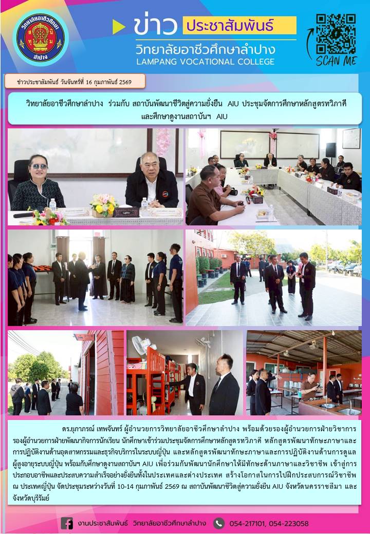 ดร.ยุภาภรณ์ เทพจันทร์ ผู้อำนวยการวิทยาลัยอาชีวศึกษาลำปาง พร้อมด้วยรองผู้อำนวยการฝ่ายวิชาการ รองผู้อำนวยการฝ่ายพัฒนากิจการนักเรียน นักศึกษาเข้าร่วมประชุมจัดการศึกษาหลักสูตรทวิภาคี หลักสูตรพัฒนาทักษะภาษาและการปฏิบัติงานด้านอุตสาหกรรมและธุรกิจบริการในระบบญี่ปุ่น และหลักสูตรพัฒนาทักษะภาษาและการปฏิบัติงานด้านการดูแลผู้สูงอายุระบบญี่ปุ่น พร้อมกับศึกษาดูงานสถาบันฯ AIU เพื่อร่วมกันพัฒนานักศึกษาให้มีทักษะด้านภาษาและวิชาชีพ เข้าสู่การประกอบอาชีพและประสบความสำเร็จอย่างยั่งยืนทั้งในประเทศและต่างประเทศ สร้างโอกาสในการไปฝึกประสบการณ์วิชาชีพ ณ ประเทศญี่ปุ่น จัดประชุมระหว่างวันที่ 10-14 กุมภาพันธ์ 2569 ณ สถาบันพัฒนาชีวิตสู่ความยั่งยืน AIU จังหวัดนครราชสีมา และจังหวัดบุรีรัมย์