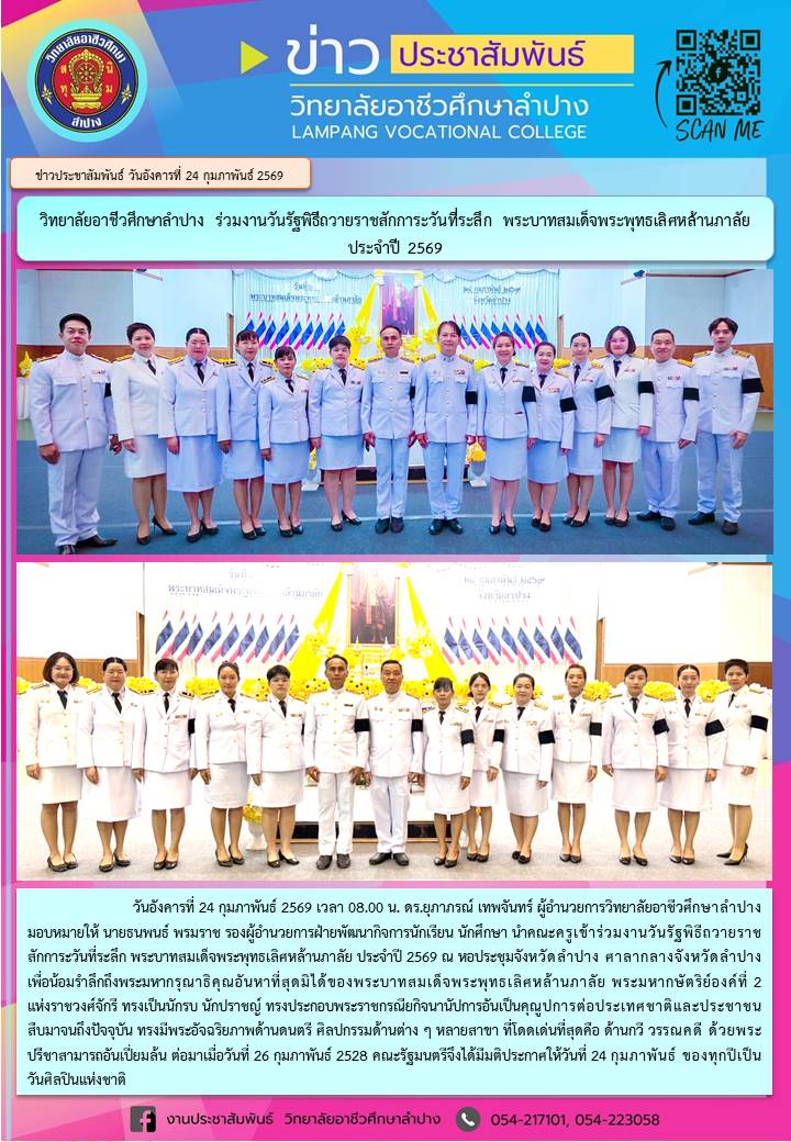 วันอังคารที่ 24 กุมภาพันธ์ 2569 เวลา 08.00 น. ดร.ยุภาภรณ์ เทพจันทร์ ผู้อำนวยการวิทยาลัยอาชีวศึกษาลำปาง มอบหมายให้ นายธนพนธ์ พรมราช รองผู้อำนวยการฝ่ายพัฒนากิจการนักเรียน นักศึกษา นำคณะครูเข้าร่วมงานวันรัฐพิธีถวายราชสักการะวันที่ระลึก พระบาทสมเด็จพระพุทธเลิศหล้านภาลัย ประจำปี 2569 ณ หอประชุมจังหวัดลำปาง ศาลากลางจังหวัดลำปาง เพื่อน้อมรำลึกถึงพระมหากรุณาธิคุณอันหาที่สุดมิได้ของพระบาทสมเด็จพระพุทธเลิศหล้านภาลัย พระมหากษัตริย์องค์ที่ 2 แห่งราชวงศ์จักรี ทรงเป็นนักรบ นักปราชญ์ ทรงประกอบพระราชกรณียกิจนานัปการอันเป็นคุณูปการต่อประเทศชาติและประชาชนสืบมาจนถึงปัจจุบัน ทรงมีพระอัจฉริยภาพด้านดนตรี ศิลปกรรมด้านต่าง ๆ หลายสาขา ที่โดดเด่นที่สุดคือ ด้านกวี วรรณคดี ด้วยพระปรีชาสามารถอันเปี่ยมล้น ต่อมาเมื่อวันที่ 26 กุมภาพันธ์ 2528 คณะรัฐมนตรีจึงได้มีมติประกาศให้วันที่ 24 กุมภาพันธ์ ของทุกปีเป็นวันศิลปินแห่งชาติ