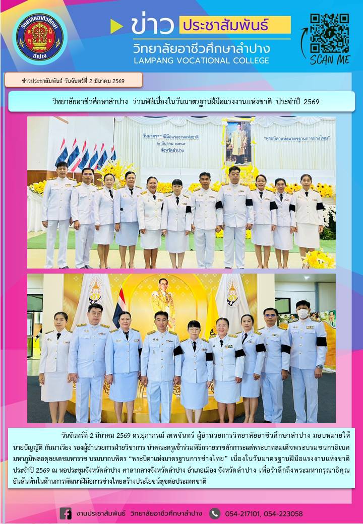 วันจันทร์ที่ 2 มีนาคม 2569 ดร.ยุภาภรณ์ เทพจันทร์ ผู้อำนวยการวิทยาลัยอาชีวศึกษาลำปาง มอบหมายให้ นายบัญญัติ กันมาเวียง รองผู้อำนวยการฝ่ายวิชาการ นำคณะครูเข้าร่วมพิธีถวายราชสักการะแด่พระบาทสมเด็จพระบรมชนกาธิเบศ มหาภูมิพลอดุลยเดชมหาราช บรมนาถบพิตร “พระบิดาแห่งมาตรฐานการช่างไทย” เนื่องในวันมาตรฐานฝีมือแรงงานแห่งชาติ ประจำปี 2569 ณ หอประชุมจังหวัดลำปาง ศาลากลางจังหวัดลำปาง อำเภอเมือง จังหวัดลำปาง เพื่อรำลึกถึงพระมหากรุณาธิคุณอันล้นพ้นในด้านการพัฒนาฝีมือการช่างไทยสร้างประโยชน์สุขต่อประเทศชาติ
