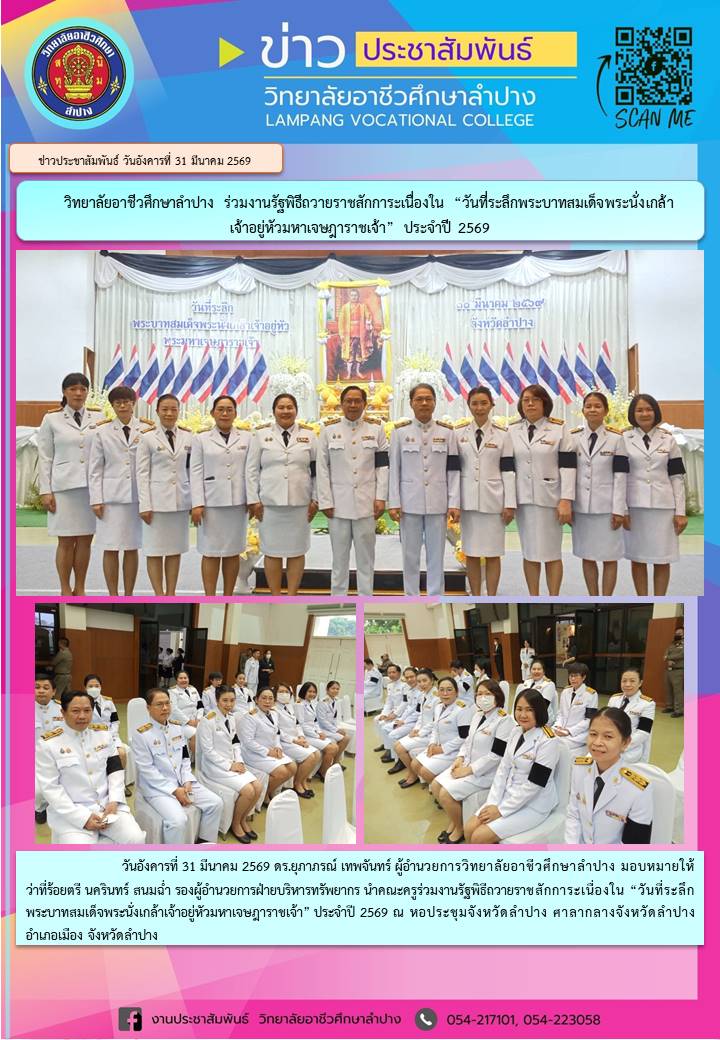 วันอังคารที่ 31 มีนาคม 2569 ดร.ยุภาภรณ์ เทพจันทร์ ผู้อำนวยการวิทยาลัยอาชีวศึกษาลำปาง มอบหมายให้ว่าที่ร้อยตรี นครินทร์ สนมฉ่ำ รองผู้อำนวยการฝ่ายบริหารทรัพยากร นำคณะครูร่วมงานรัฐพิธีถวายราชสักการะเนื่องใน “วันที่ระลึกพระบาทสมเด็จพระนั่งเกล้าเจ้าอยู่หัวมหาเจษฎาราชเจ้า” ประจำปี 2569 ณ หอประชุมจังหวัดลำปาง ศาลากลางจังหวัดลำปาง อำเภอเมือง จังหวัดลำปาง