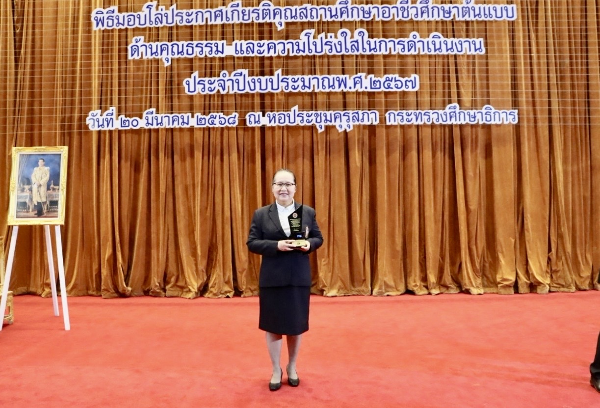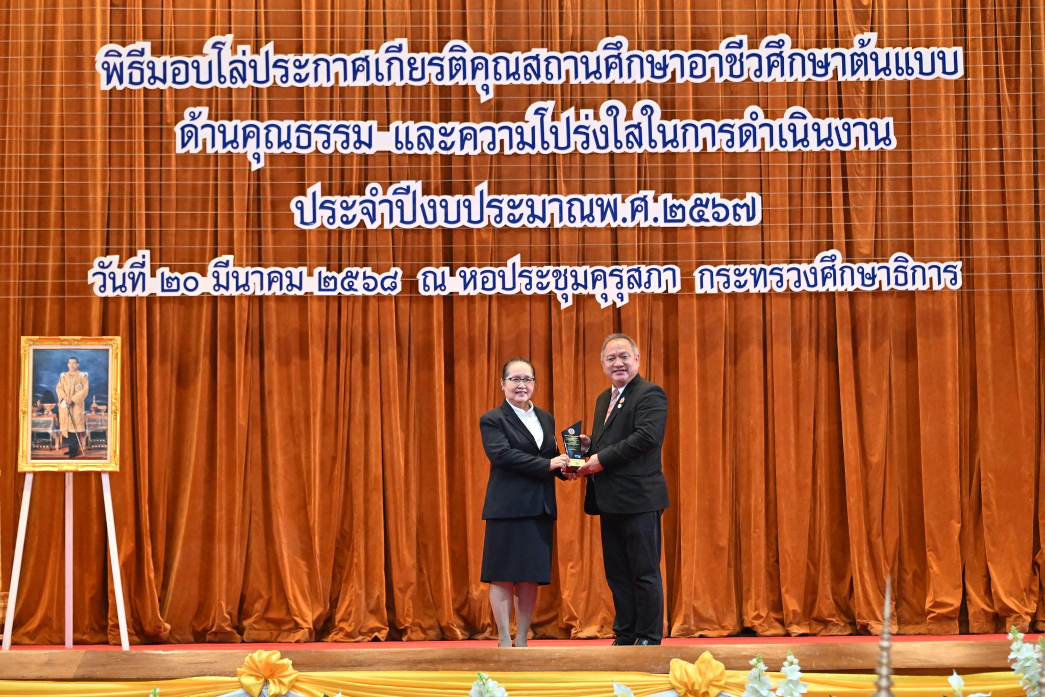 วันพฤหัสบดีที่ 20 มีนาคม 2568 เวลา 08.00 น. นายยศพล เวณุโกเศศ เลขาธิการคณะกรรมการการอาชีวศึกษา เป็นประธานมอบโล่ประกาศเกียรติคุณสถานศึกษาต้นแบบด้านคุณธรรมและความโปร่งใสในการดำเนินงาน ประจำปีงบประมาณ พ.ศ. 2567 โดยหน่วยศึกษานิเทศก์ สำนักงานคณะกรรมการการอาชีวศึกษา ทั้งนี้ ดร.ยุภาภรณ์ เทพจันทร์ ผู้อำนวยการวิทยาลัยอาชีวศึกษาลำปาง เข้ารับโล่ประกาศเกียรติคุณสถานศึกษาต้นแบบด้านคุณธรรมและความโปร่งใสในการดำเนินงาน ประจำปีงบประมาณ พ.ศ. 2567 ภายใต้โครงการเสริมสร้างคุณธรรม จริยธรรม และธรรมาภิบาลในสถานศึกษา แผนงานบูรณาการต่อต้านการทุจริต และประพฤติมิชอบ ประจำปีงบประมาณ พ.ศ. 2568 ณ หอประชุมคุรุสภา กรุงเทพมหานคร