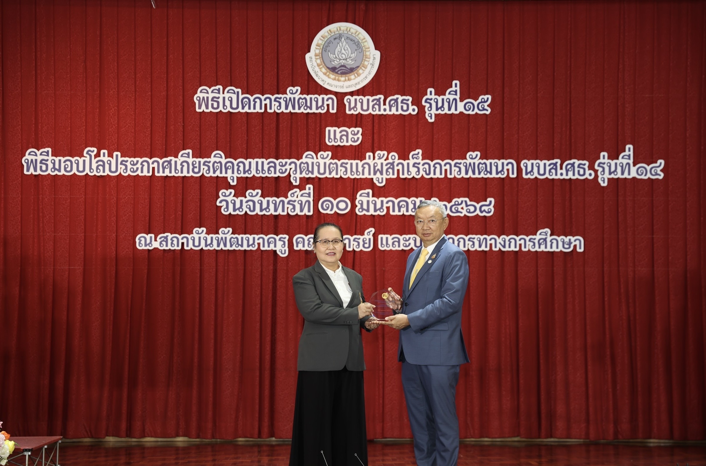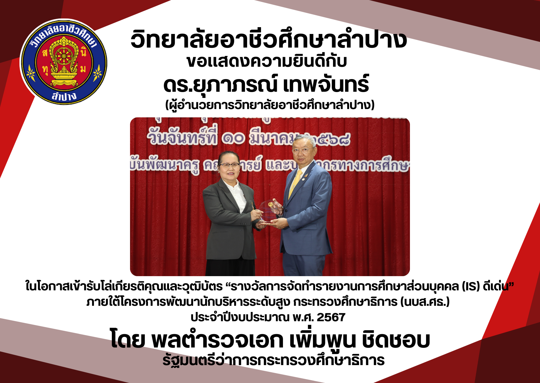วันจันทร์ที่ 10 มีนาคม 2568 เวลา 09.00 น. พลตำรวจเอก เพิ่มพูน ชิดชอบ รัฐมนตรีว่าการกระทรวงศึกษาธิการ เป็นประธานพิธีมอบโล่ประกาศเกียรติคุณและวุฒิบัตรแก่ผู้สำเร็จการพัฒนา นบส.ศธ. รุ่นที่ 14 ประจำปีงบประมาณ พ.ศ. 2567 ทั้งนี้ ดร.ยุภาภรณ์ เทพจันทร์ ผู้อำนวยการวิทยาลัยอาชีวศึกษาลำปาง เข้ารับโล่ประกาศเกียรติคุณและวุฒิบัตร รางวัล การจัดทำรายงานการศึกษาส่วนบุคคล (IS) ดีเด่น โครงการพัฒนานักบริหารระดับสูง กระทรวงศึกษาธิการ (นบส.ศธ.) ณ ห้องพุทธรักษา อาคารอเนกประสงค์ สถาบันพัฒนาครู คณาจารย์ และบุคลากรทางการศึกษา อำเภอสามพราน จังหวัดนครปฐม