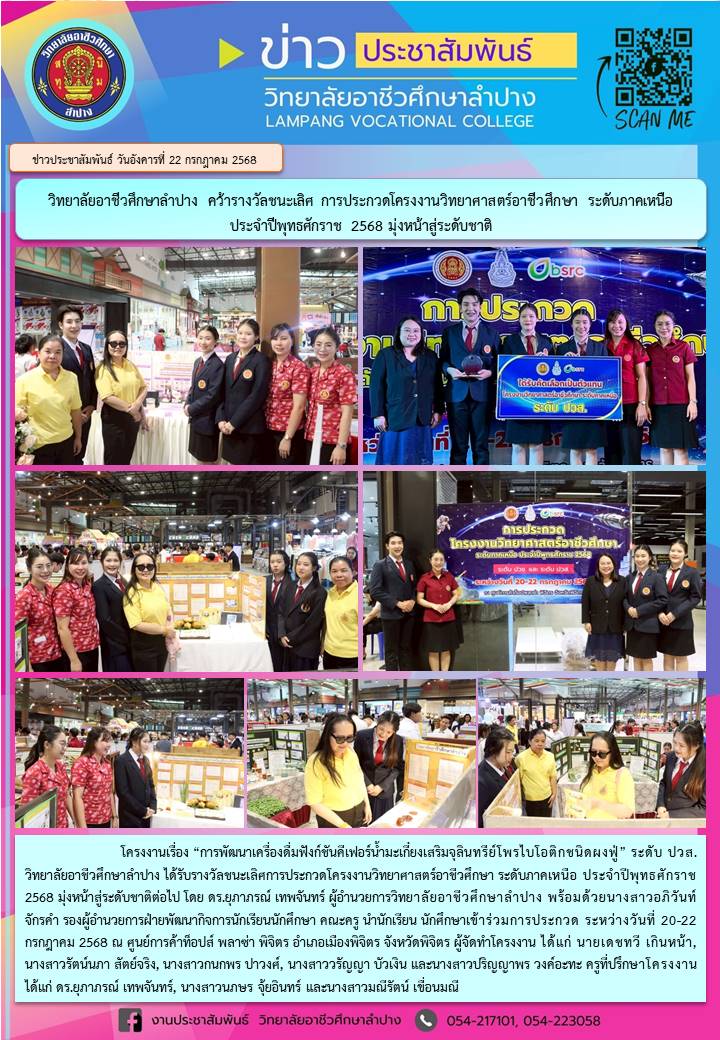 รางวัลชนะเลิศการประกวดโครงงานวิทยาศาสตร์อาชีวศึกษา ระดับภาคเหนือ ประจำปีพุทธศักราช 2568