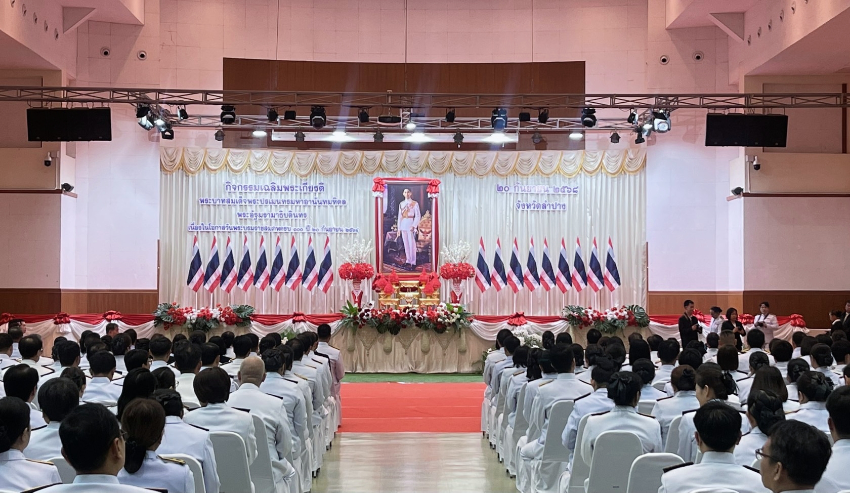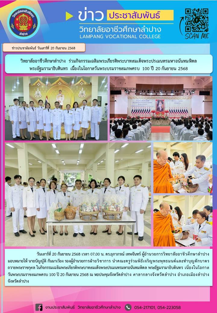 วันเสาร์ที่ 20 กันยายน 2568 เวลา 07.00 น. ดร.ยุภาภรณ์ เทพจันทร์ ผู้อำนวยการวิทยาลัยอาชีวศึกษาลำปาง มอบหมายให้ นายบัญญัติ กันมาเวียง รองผู้อำนวยการฝ่ายวิชาการ นำคณะครูร่วมพิธีเจริญพระพุทธมนต์และทำบุญตักบาตรถวายพระราชกุศล ในกิจกรรมเฉลิมพระเกียรติพระบาทสมเด็จพระปรเมนทรมหาอนันทมหิดล พระอัฐมรามาธิบดินทร เนื่องในโอกาสวันพระบรมราชสมภพครบ 100 ปี 20 กันยายน 2568 ณ หอประชุมจังหวัดลำปาง ศาลากลางจังหวัดลำปาง อำเภอเมืองลำปาง จังหวัดลำปาง