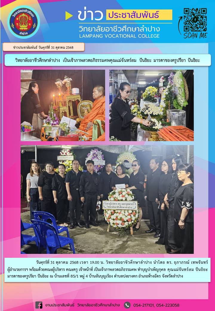 วันศุกร์ที่ 31 ตุลาคม 2568 เวลา 19.00 น. วิทยาลัยอาชีวศึกษาลำปาง นำโดย ดร. ยุภาภรณ์ เทพจันทร์ ผู้อำนวยการฯ พร้อมด้วยคณะผู้บริหาร คณะครู เจ้าหน้าที่ เป็นเจ้าภาพสวดอภิธรรมศพ ทำบุญบำเพ็ญกุศล คุณแม่จันทร์สม ปันธิยะ มารดาของครูปรียา ปันธิยะ ณ บ้านเลขที่ 85/1 หมู่ 4 บ้านสันบุญเรือง ตำบลปงยางคก อำเภอห้างฉัตร จังหวัดลำปาง
