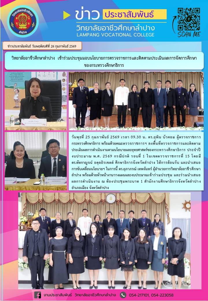 วันพุธที่ 25 กุมภาพันธ์ 2569 เวลา 09.30 น. ดร.ยุพิน บัวคอม ผู้ตรวจราชการกระทรวงศึกษาธิการ พร้อมด้วยคณะตรวจราชการฯ ลงพื้นที่ตรวจราชการและติดตามประเมินผลการดำเนินงานตามนโยบายและยุทธศาสตร์ของกระทรวงศึกษาธิการ ประจำปีงบประมาณ พ.ศ. 2569 กรณีปกติ รอบที่ 1 ในเขตตรวจราชการที่ 15 โดยมี ดร.หัทกาญจน์ อดุลถิรเขตต์ ศึกษาธิการจังหวัดลำปาง ให้การต้อนรับ และนำเสนอการขับเคลื่อนนโยบายฯ ในการนี้ ดร.ยุภาภรณ์ เทพจันทร์ ผู้อำนวยการวิทยาลัยอาชีวศึกษาลำปาง พร้อมด้วยหัวหน้างานวางแผนและงบประมาณเข้าร่วมประชุม และร่วมนำเสนอผลการดำเนินงาน ณ ห้องประชุมพระบาท 1 สำนักงานศึกษาธิการจังหวัดลำปาง อำเภอเมือง จังหวัดลำปาง