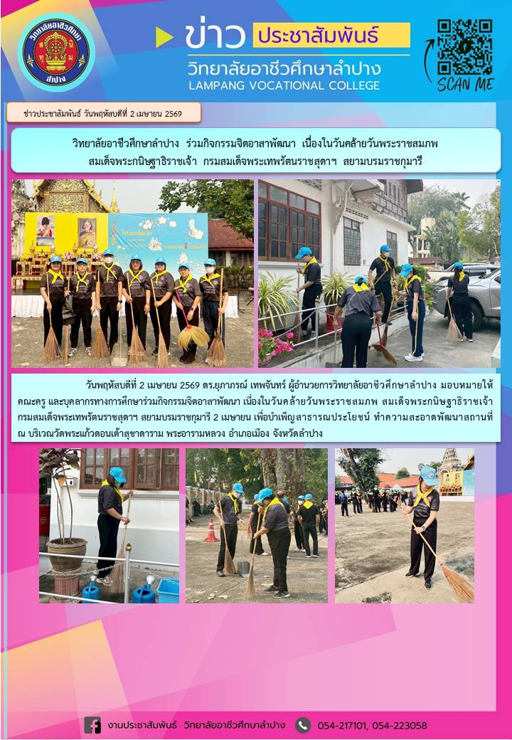 วันพฤหัสบดีที่ 2 เมษายน 2569 ดร.ยุภาภรณ์ เทพจันทร์ ผู้อำนวยการวิทยาลัยอาชีวศึกษาลำปาง มอบหมายให้คณะครู และบุคลากรทางการศึกษาร่วมกิจกรรมจิตอาสาพัฒนา เนื่องในวันคล้ายวันพระราชสมภพ สมเด็จพระกนิษฐาธิราชเจ้า กรมสมเด็จพระเทพรัตนราชสุดาฯ สยามบรมราชกุมารี 2 เมษายน เพื่อบำเพ็ญสาธารณประโยชน์ ทำความสะอาดพัฒนาสถานที่ ณ บริเวณวัดพระแก้วดอนเต้าสุชาดาราม พระอารามหลวง อำเภอเมือง จังหวัดลำปาง