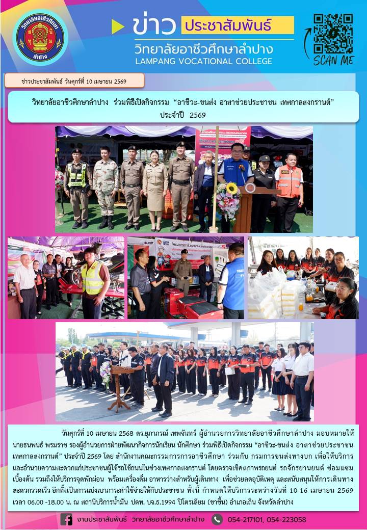 วันศุกร์ที่ 10 เมษายน 2568 ดร.ยุภาภรณ์ เทพจันทร์ ผู้อำนวยการวิทยาลัยอาชีวศึกษาลำปาง มอบหมายให้ นายธนพนธ์ พรมราช รองผู้อำนวยการฝ่ายพัฒนากิจการนักเรียน นักศึกษา ร่วมพิธีเปิดกิจกรรม “อาชีวะ-ขนส่ง อาสาช่วยประชาชน เทศกาลสงกรานต์” ประจำปี 2569 โดย สำนักงานคณะกรรมการการอาชีวศึกษา ร่วมกับ กรมการขนส่งทางบก เพื่อให้บริการและอำนวยความสะดวกแก่ประชาชนผู้ใช้รถใช้ถนนในช่วงเทศกาลสงกรานต์ โดยตรวจเช็คสภาพรถยนต์ รถจักรยานยนต์ ซ่อมแซมเบื้องต้น รวมถึงให้บริการจุดพักผ่อน พร้อมเครื่องดื่ม อาหารว่างสำหรับผู้เดินทาง เพื่อช่วยลดอุบัติเหตุ และสนับสนุนให้การเดินทางสะดวกรวดเร็ว อีกทั้งเป็นการแบ่งเบาภาระค่าใช้จ่ายให้กับประชาชน ทั้งนี้ กำหนดให้บริการระหว่างวันที่ 10-16 เมษายน 2569 เวลา 06.00 -18.00 น. ณ สถานีบริการน้ำมัน ปตท. บจ.ธ.1994 ปิโตรเลียม (ขาขึ้น) อำเภอเถิน จังหวัดลำปาง