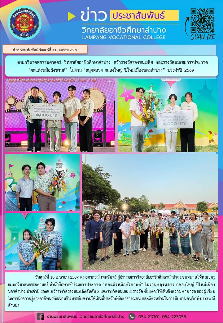 วันศุกร์ที่ 10 เมษายน 2569 ดร.ยุภาภรณ์ เทพจันทร์ ผู้อำนวยการวิทยาลัยอาชีวศึกษาลำปาง มอบหมายให้คณะครูแผนกวิชาคหกรรมศาสตร์ นำนักศึกษาเข้าร่วมการประกวด "ตกแต่งหม้อสังขานต์" ในงานสลุงหลวง กลองใหญ่ ปีใหม่เมืองนครลำปาง ประจำปี 2569 คว้ารางวัลรองชนะเลิศอันดับ 2 และรางวัลชมเชย 2 รางวัล ซึ่งแสดงให้เห็นถึงความสามารถของผู้เรียนในการนำความรู้สายอาชีพมาพัฒนาสร้างสรรค์ผลงานให้เป็นที่ประจักษ์ต่อสาธารณชน และมีส่วนร่วมในการสืบสานอนุรักษ์ประเพณีล้านนา