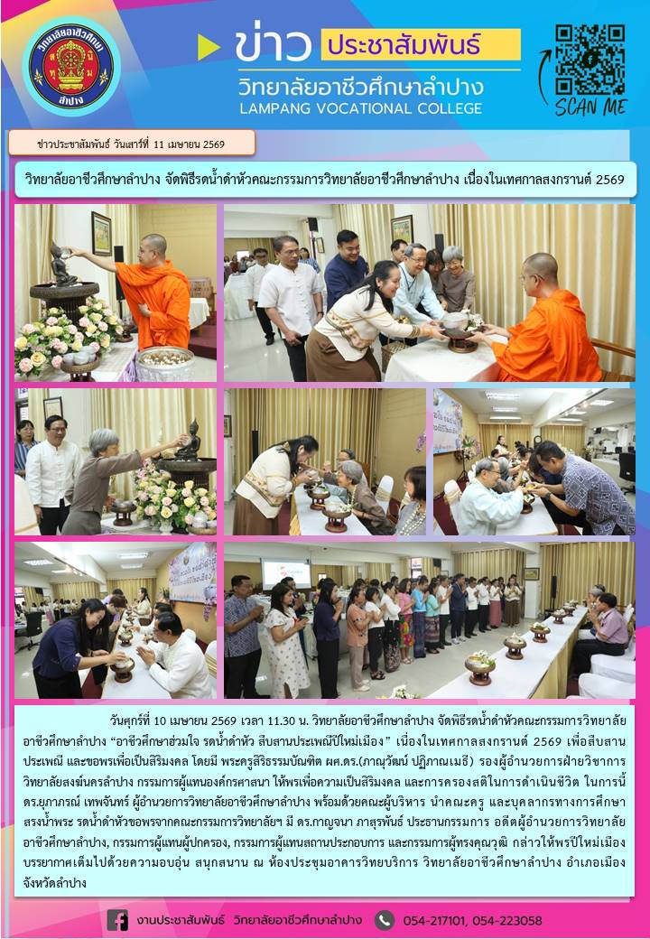 วันศุกร์ที่ 10 เมษายน 2569 เวลา 11.30 น. วิทยาลัยอาชีวศึกษาลำปาง จัดพิธีรดน้ำดำหัวคณะกรรมการวิทยาลัยอาชีวศึกษาลำปาง “อาชีวศึกษาฮ่วมใจ รดน้ำดำหัว สืบสานประเพณีปีใหม่เมือง” เนื่องในเทศกาลสงกรานต์ 2569 เพื่อสืบสานประเพณี และขอพรเพื่อเป็นสิริมงคล โดยมี พระครูสิริธรรมบัณฑิต ผศ.ดร.(ภาณุวัฒน์ ปฏิภาณเมธี) รองผู้อำนวยการฝ่ายวิชาการ วิทยาลัยสงฆ์นครลำปาง กรรมการผู้แทนองค์กรศาสนา ให้พรเพื่อความเป็นสิริมงคล และการครองสติในการดำเนินชีวิต ในการนี้ ดร.ยุภาภรณ์ เทพจันทร์ ผู้อำนวยการวิทยาลัยอาชีวศึกษาลำปาง พร้อมด้วยคณะผู้บริหาร นำคณะครู และบุคลากรทางการศึกษา สรงน้ำพระ รดน้ำดำหัวขอพรจากคณะกรรมการวิทยาลัยฯ มี ดร.กาญจนา ภาสุรพันธ์ ประธานกรรมการ อดีตผู้อำนวยการวิทยาลัยอาชีวศึกษาลำปาง, กรรมการผู้แทนผู้ปกครอง, กรรมการผู้แทนสถานประกอบการ และกรรมการผู้ทรงคุณวุฒิ กล่าวให้พรปีใหม่เมือง บรรยากาศเต็มไปด้วยความอบอุ่น สนุกสนาน ณ ห้องประชุมอาคารวิทยบริการ วิทยาลัยอาชีวศึกษาลำปาง อำเภอเมือง จังหวัดลำปาง