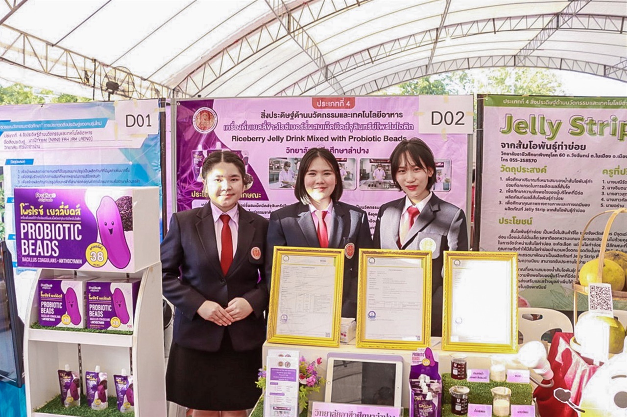 รางวัลรองชนะเลิศอันดับ 2 สิ่งประดิษฐ์ประเภทที่ 4 ด้านนวัตกรรมและเทคโนโลยีอาหาร เครื่องดื่มเยลลี่ข้าวไรซ์เบอร์รี่ผสมเม็ดบีดส์จุลินทรีย์โพรไบโอติก