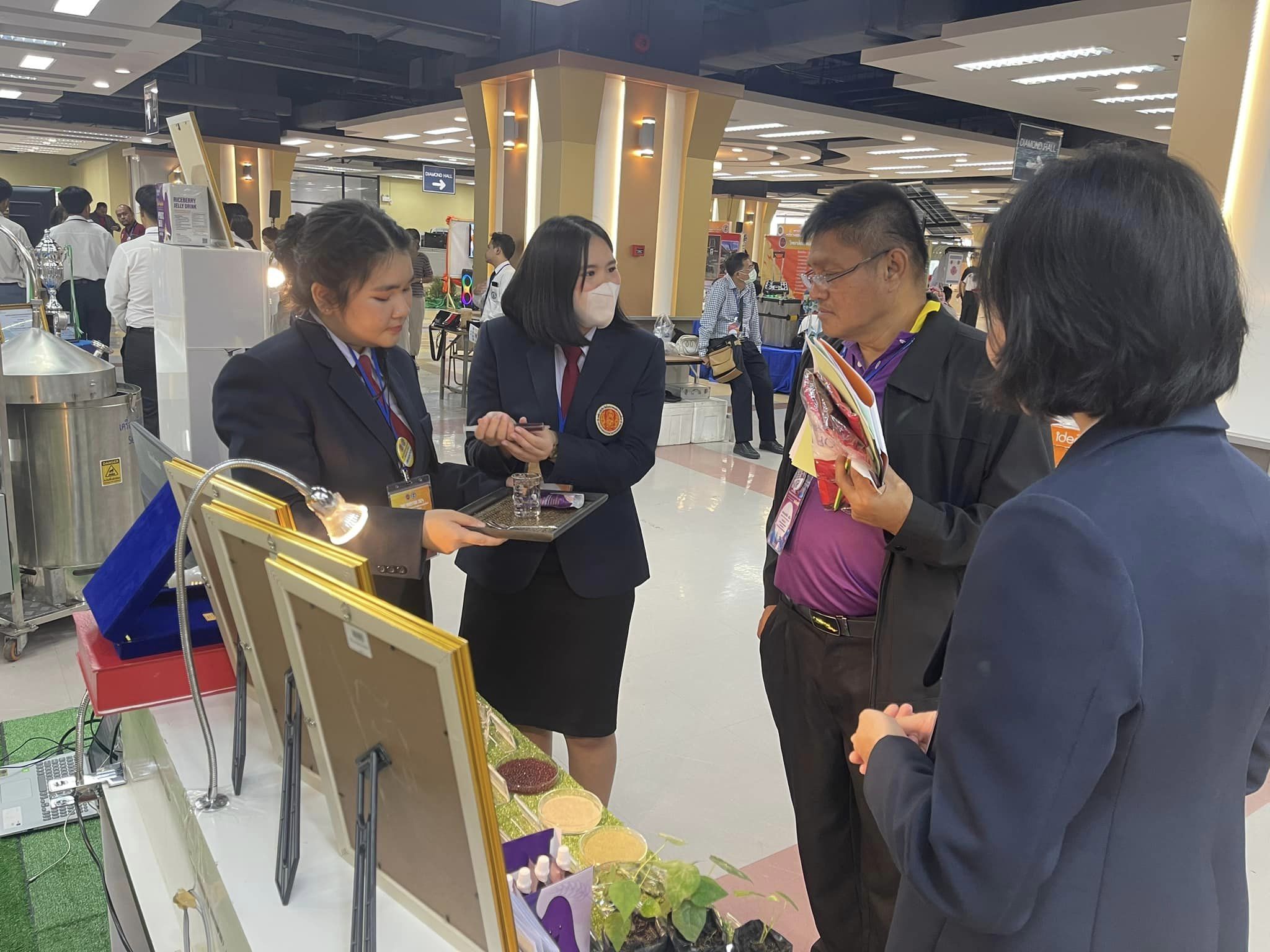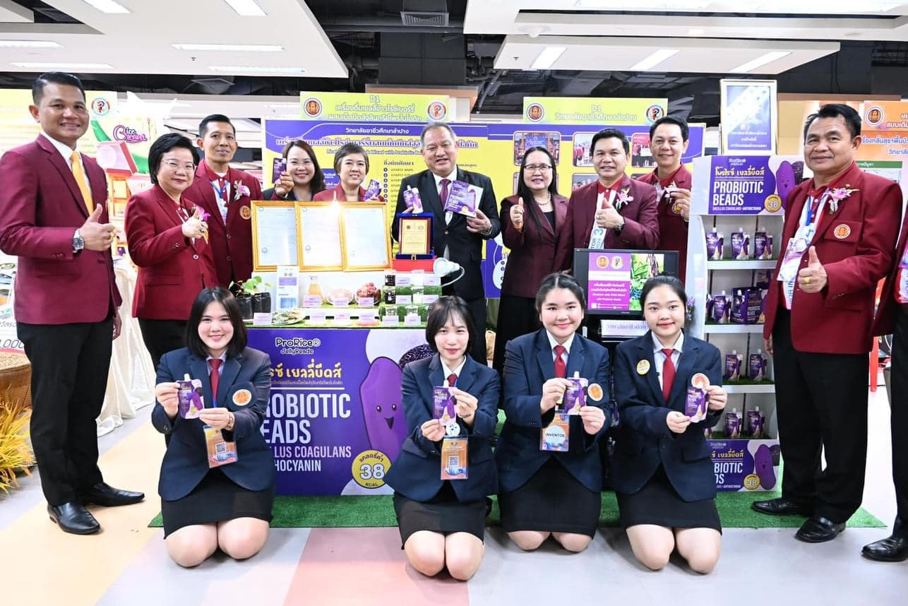 สุดยอดนวัตกรรมอาชีวศึกษา การประกวดสิ่งประดิษฐ์ของคนรุ่นใหม่ ประเภทที่ 4 ด้านนวัตกรรมและเทคโนโลยีอาหาร ผลงาน เครื่องดื่มเยลลี่ข้าวไรซ์เบอร์รี่ผสมเม็ดบีดส์จุลินทรีย์โพรไบโอติก